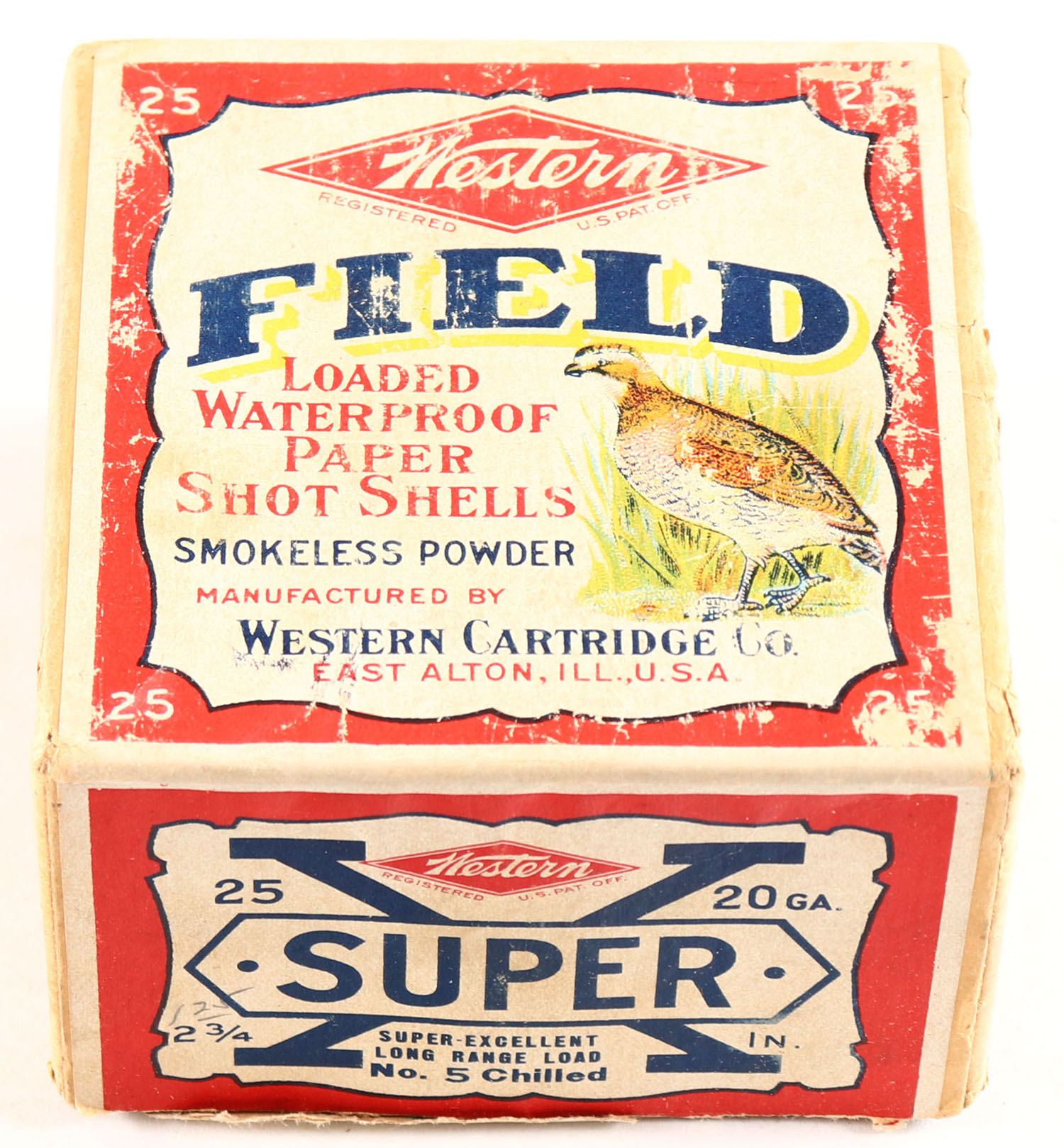 Western, Field/Super X, Label was made during transition from Field boxes to Super X boxes. 20ga., 2pc, Empty, shot size 5CH., box has scuffing & light edge wear with good label. Grade: Very Good + - Value: 40 to 140