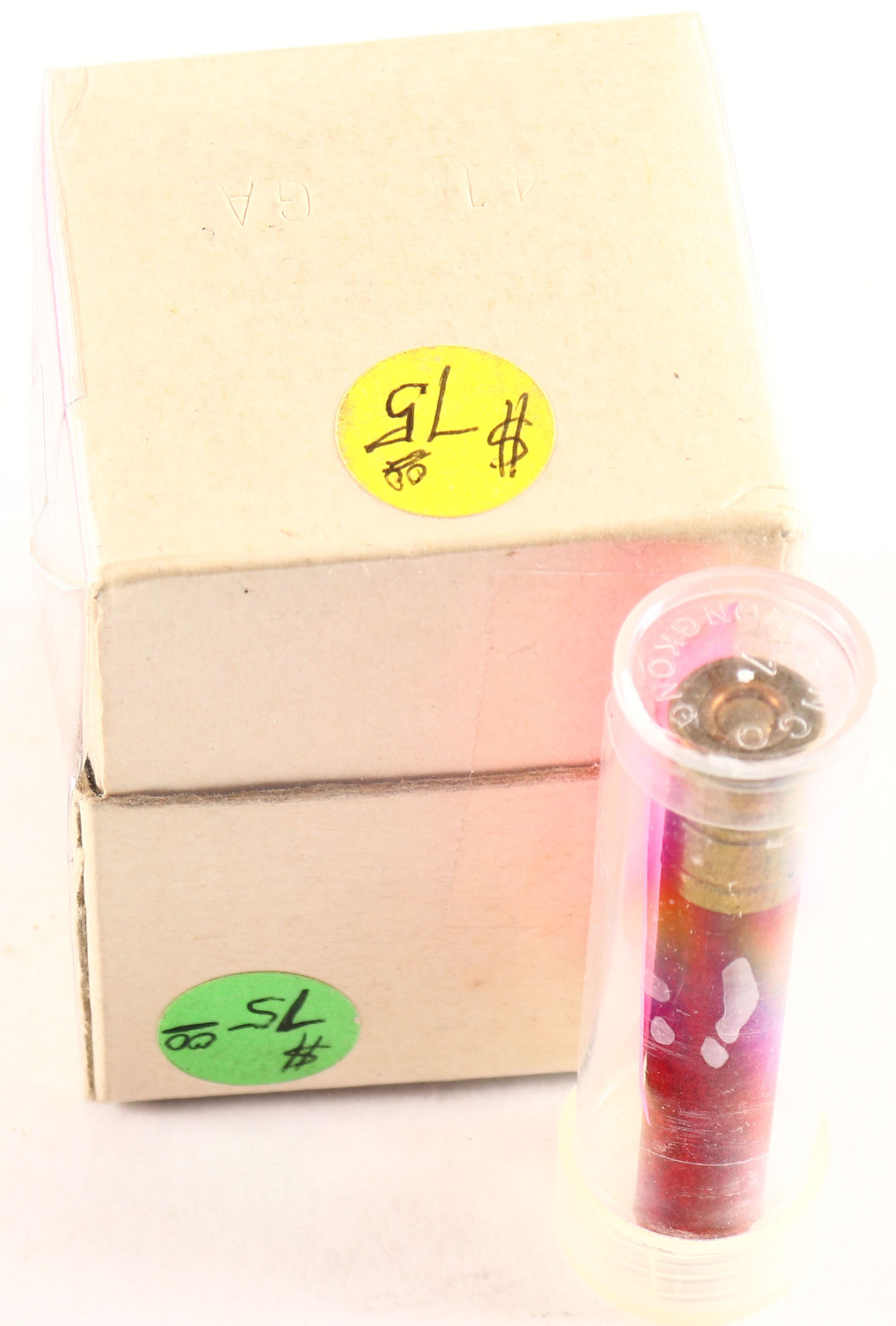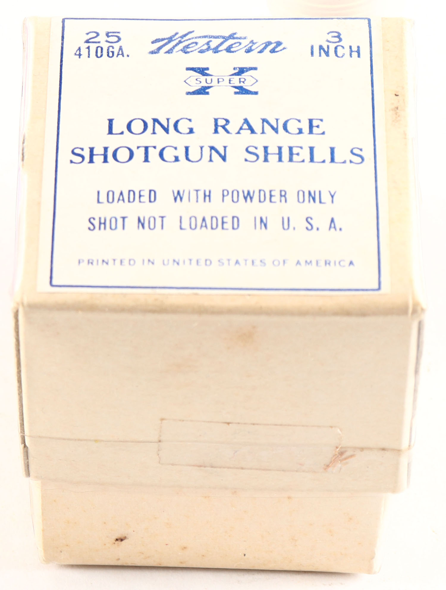 Western, Super-X, 410ga., 3'', 2pc, Full, Loaded with Powder Only, box come with 26th shell, box is solid with very nice label. Grade: Excellent + - Value: 40 to 100