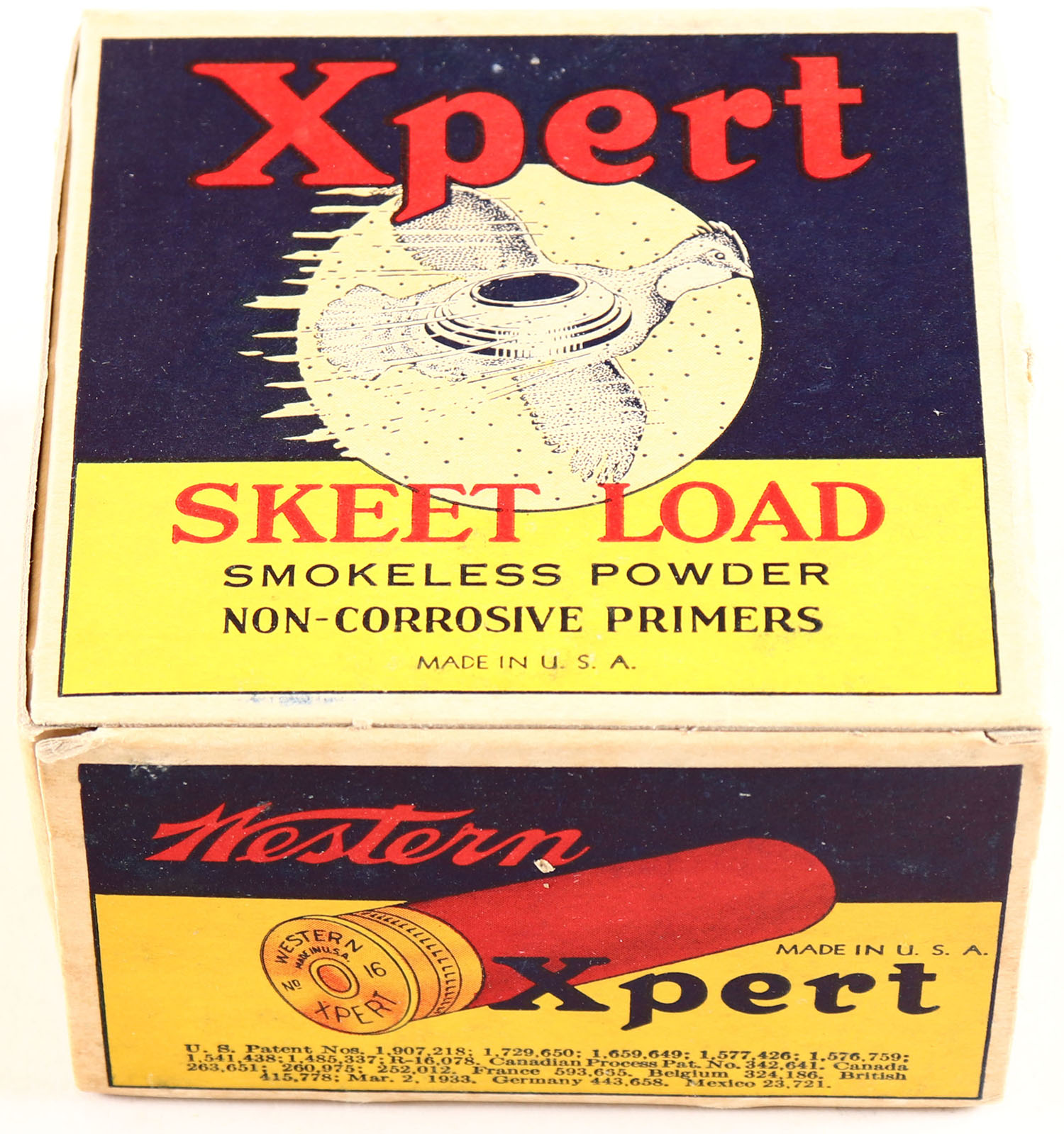 Western Xpert, SKEET LOAD, 16ga., 1pc., Full, buff box with blue & red on box that pictures flying Quail with skeet in body & shot all around, Loading: 2 1/2 Drams 1 Oz. No. 9 Chilled Shot, box is very solid with great colors, Shells are excellent. Grade: Excellent ++ - Value: 100 to 500