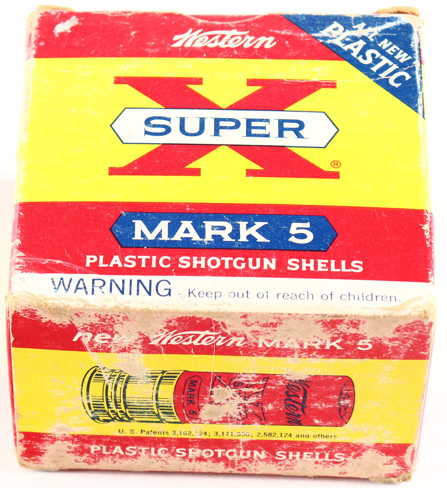 Western, Super X, Mark 5, 16ga., 2 3/4'', 1pc., Full, shot size 6, multi-colored box, box is solid with light age scuffing & light edge wear, box has very nice colors, shells are very good. Grade: Very Good + - Value: 10 to 30