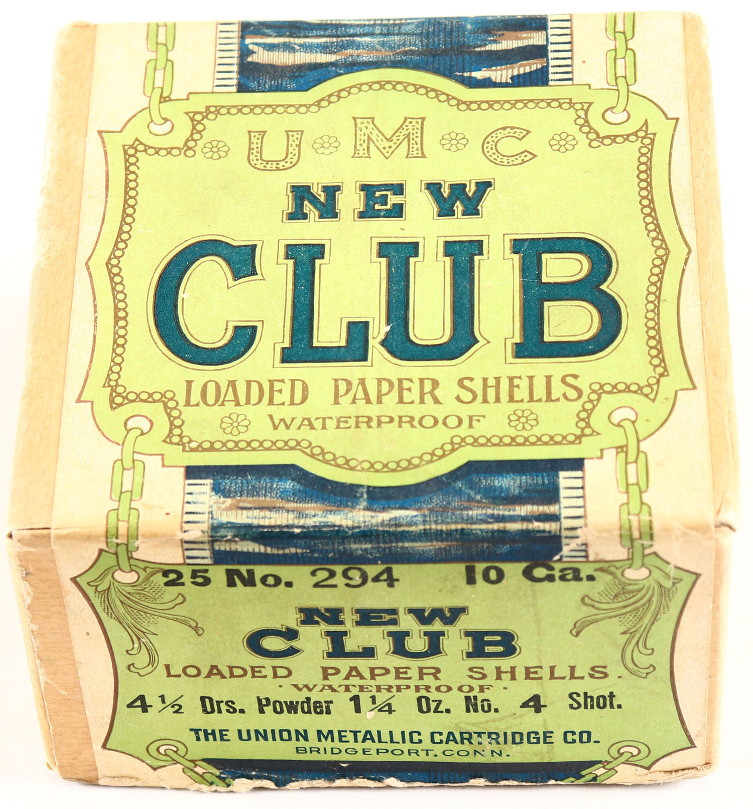 REM-UMC, New Club, 10 GAUGE!, 2pc., Empty, shot size 4, buff box with green, yellow, blue paper label, with great colors to label, box is very solid. Grade: Excellent + - Value: 40 to 100
