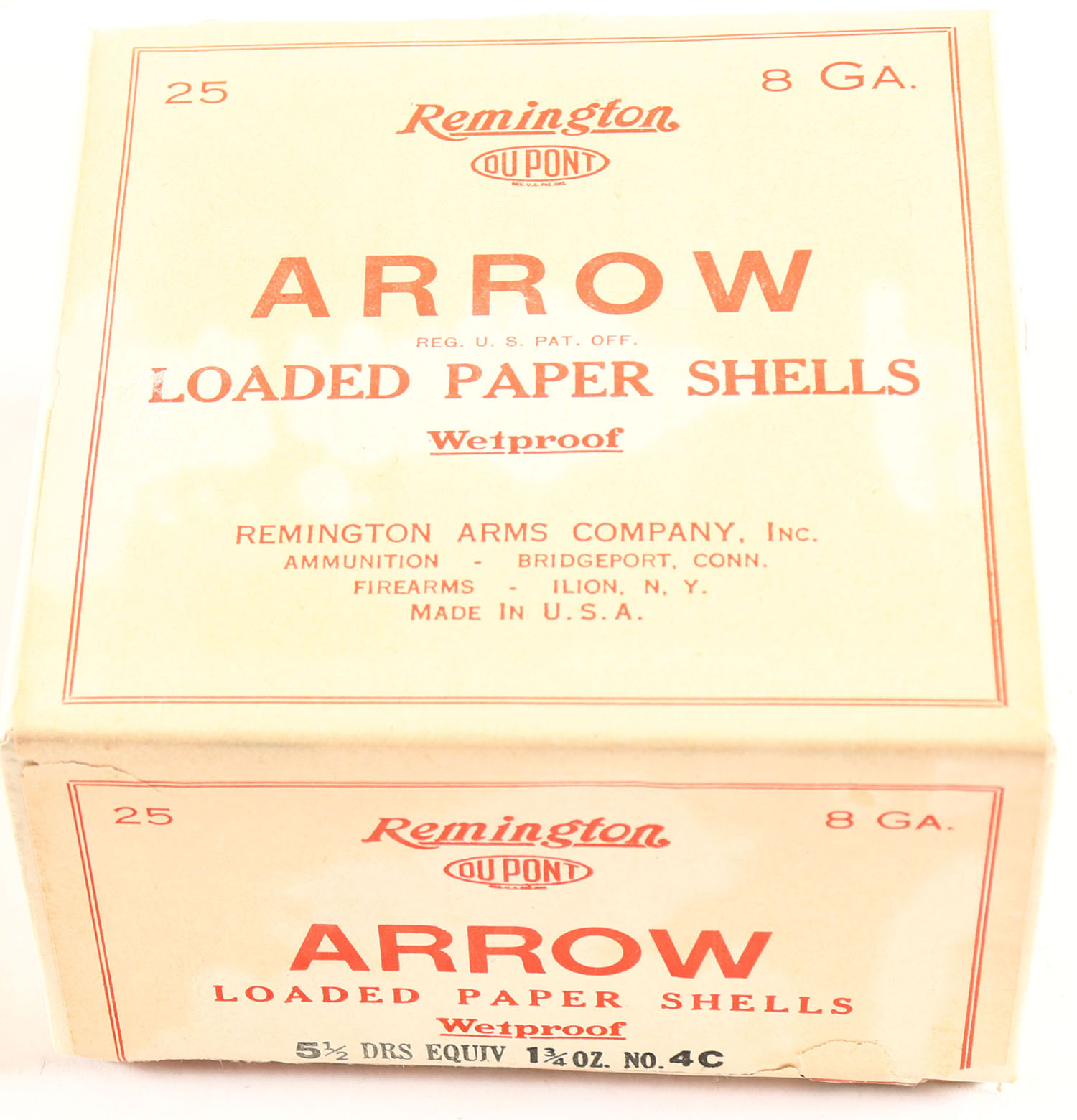 Remington UMC, ARROW, 8ga., 2pc., Full, Loading: 5 1/2 Drs. 1 3/4 Oz. No. 4C, buff box with buff & red label, box & label are very nice with small seam splits, Shells are excellent. Grade: Excellent + - Value: 100 to 600