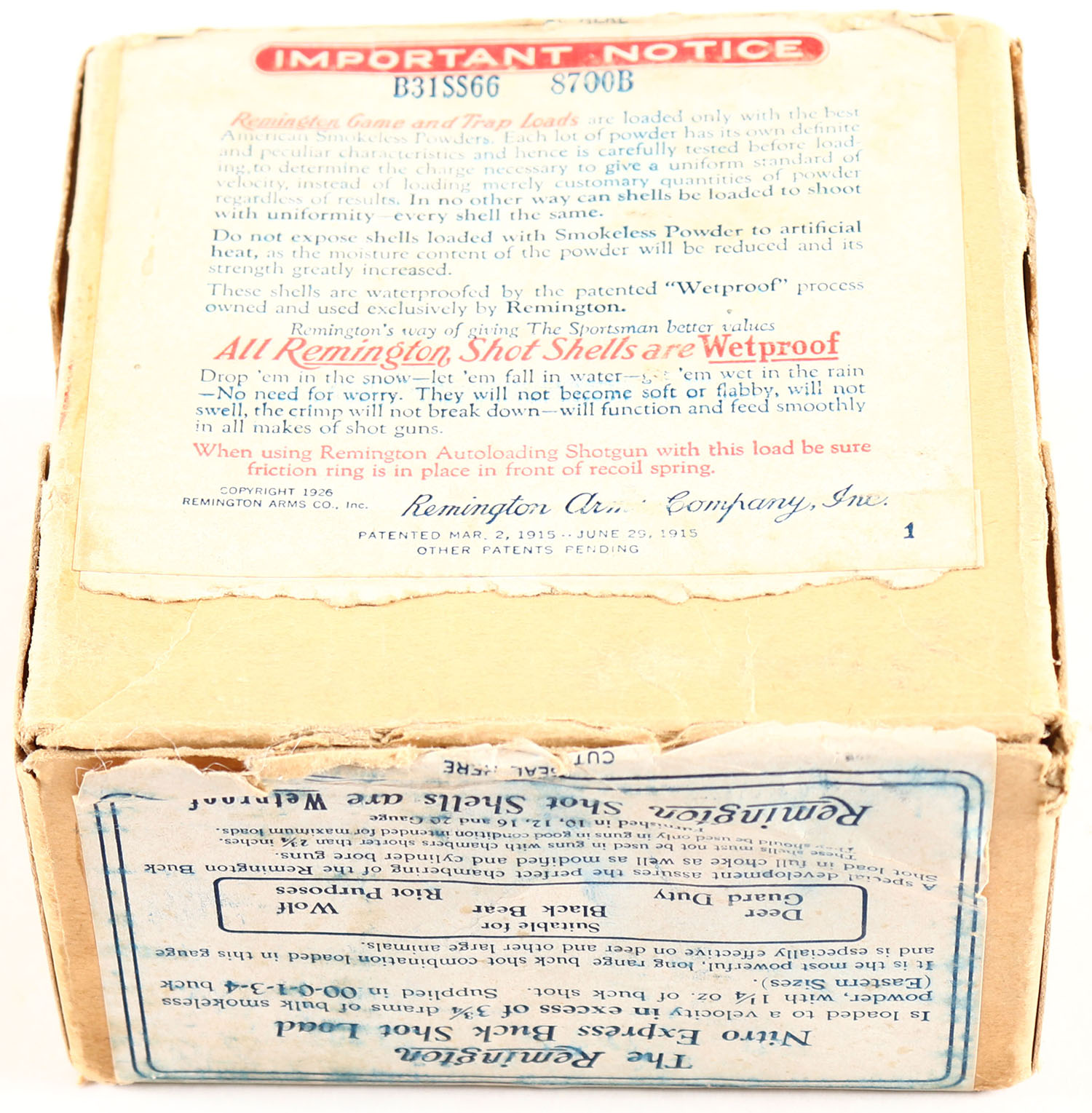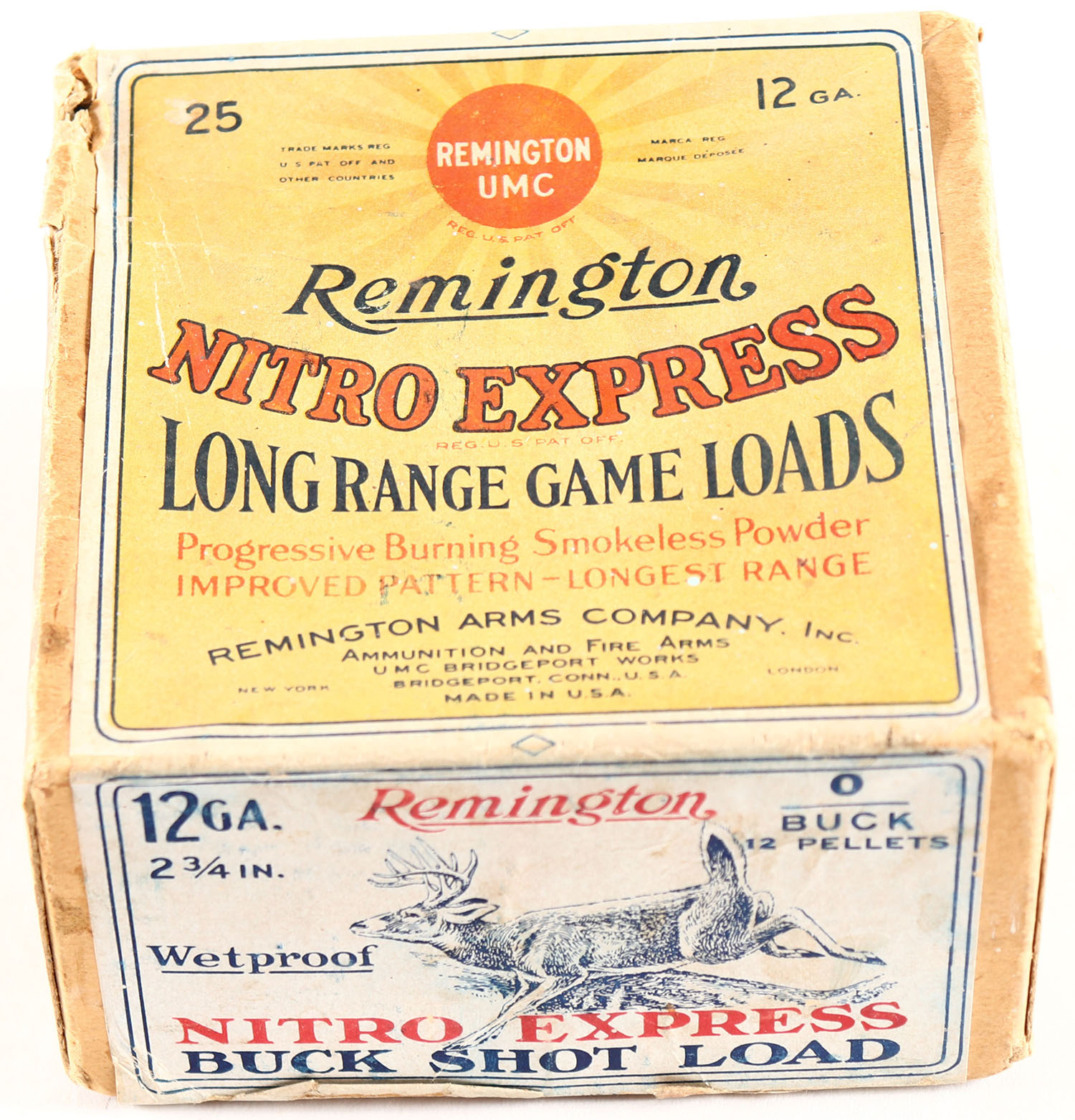 Remington UMC Nitro Express, Long Range Game Loads, pictures Buck jumping, 12ga., 2pc., Empty, shot size 0 BUCK, buff box with sunburst logo & BUCK on side, box is solid with age soiling, light edge wear & very nice colors. Grade: Very Good ++ - Value: 100 to 300