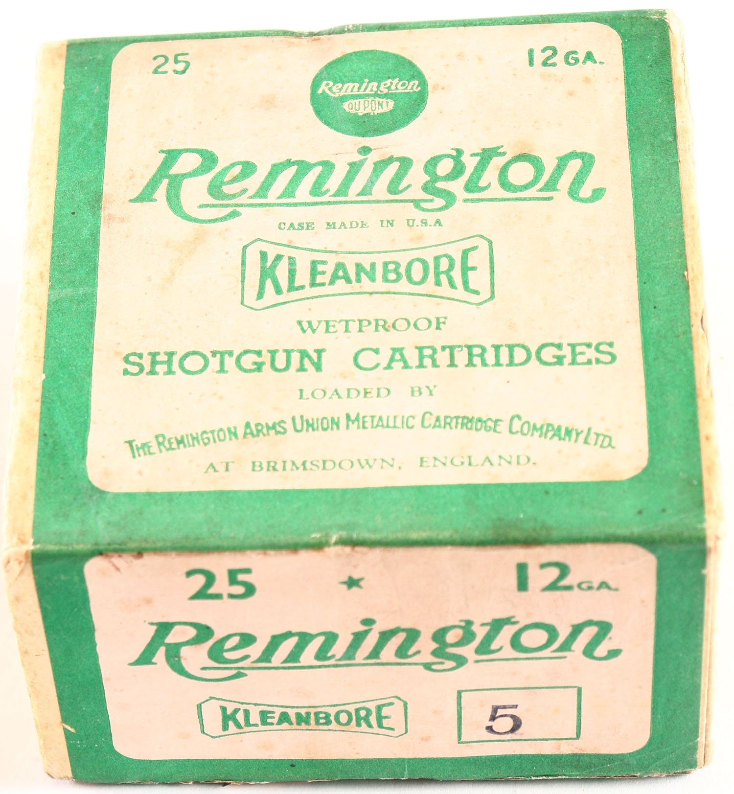 Remington, Kleanbore, LOADED IN ENGLAND, 12ga., 2pc., Empty, shot size 5, buff box with green paper label, box is very solid with age soiling. Grade: Very Good ++ - Value: 40 to 100