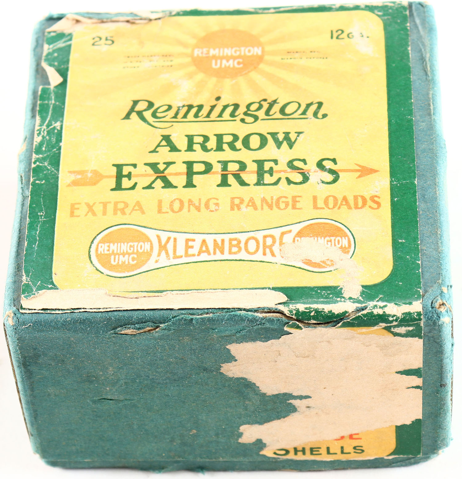 Remington UMC Arrow Express, 12ga., 2pc., Partial 15 rds., shot size 4C, green box with sunburst logo, box has scuffing & soiling with nice colors to label, shells are fair. Grade: Very Good + - Value: 40 to 100
