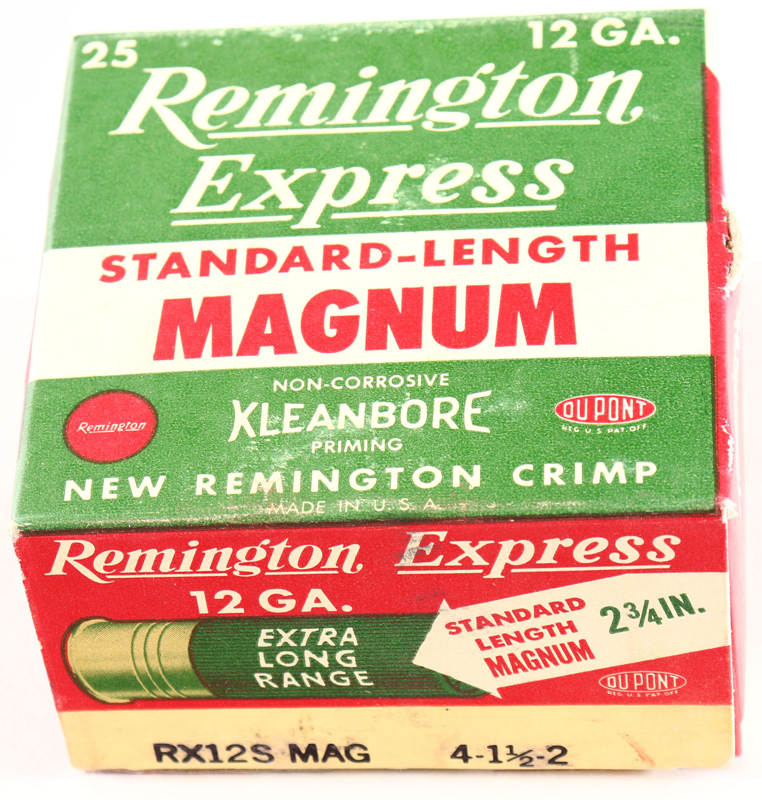 Remington Express, Standard Length Magnum, 12ga., 2 3/4'', 1pc., Full, shot size 2, box is red, white and green, box has some shell protrusion, box is very solid with great colors, shells are excellent. Grade: Excellent - Value: 10 to 40