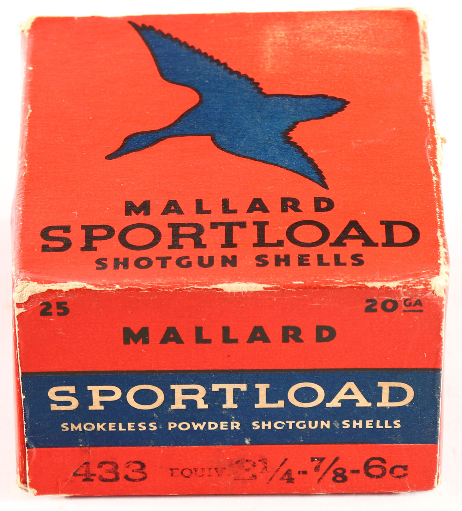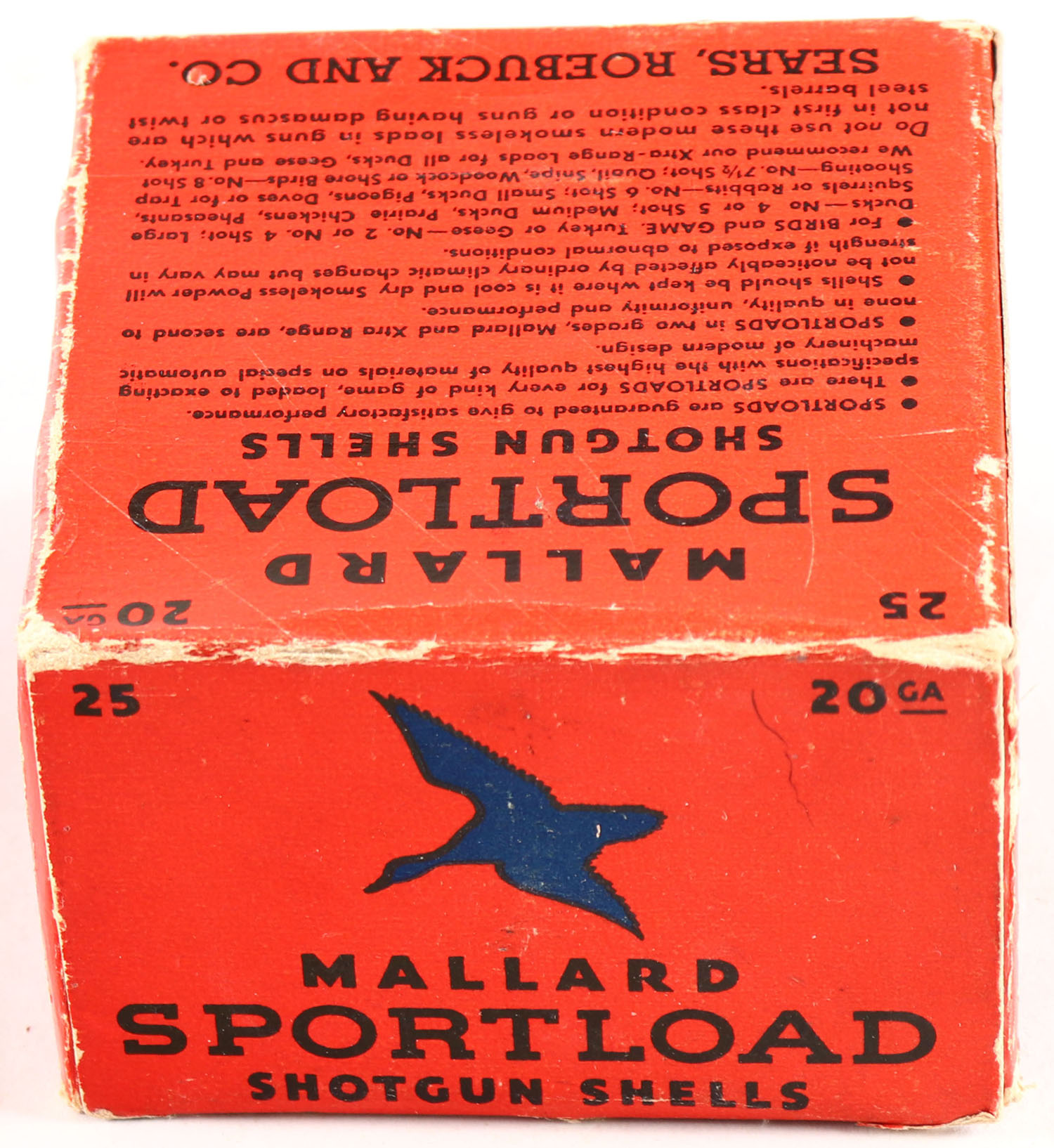 Sears, Sportload MALLARD, 12ga., 1pc., Full, shot size 6c, red & blue box that pictures a Mallard in flight, box is solid with great colors and light edge wear, shells are very good. Grade: Excellent - Value: 30 to 60
