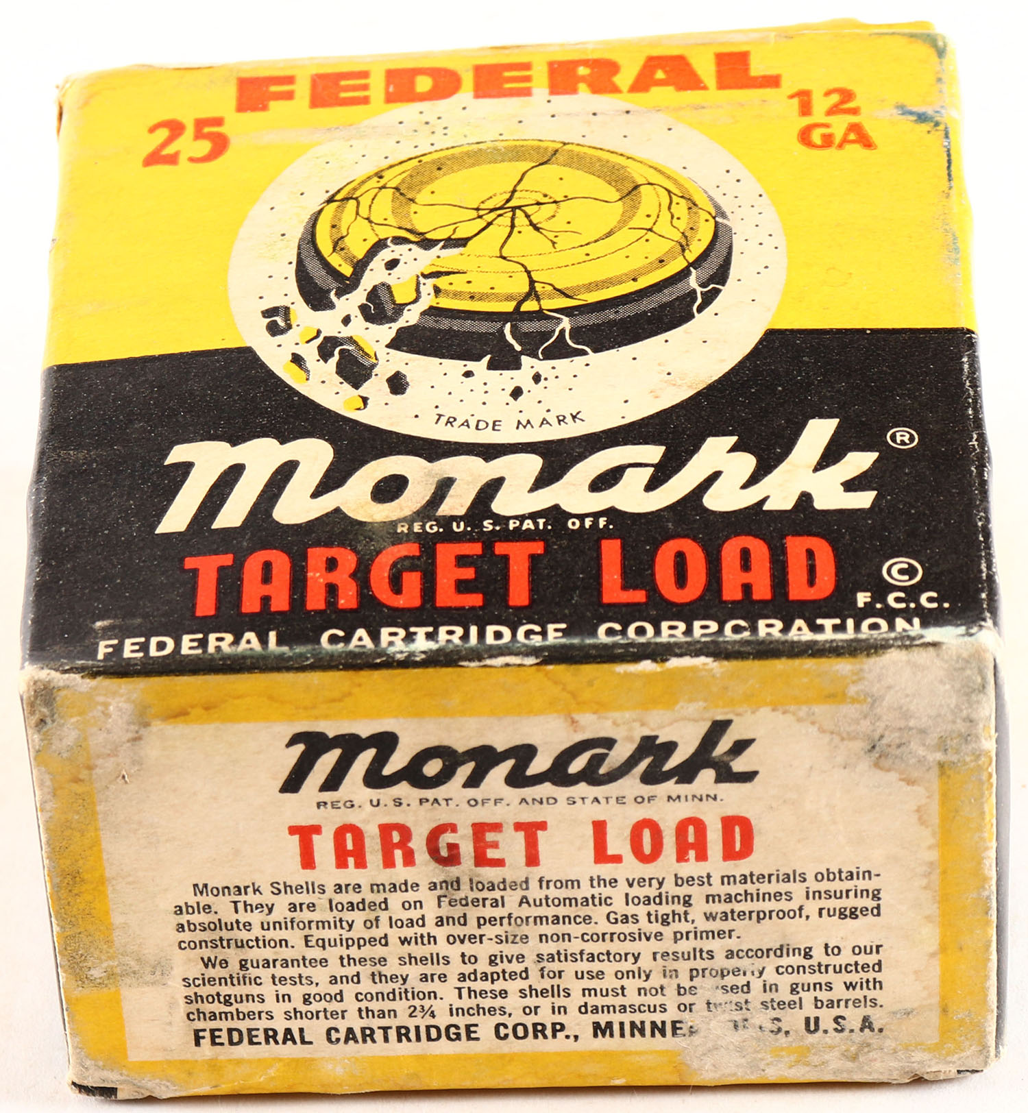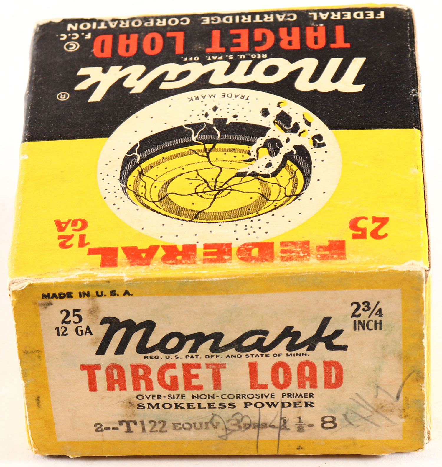Federal, Monark, Target Load, 12ga., 1pc., Full with 11rds being correct, shot size 8, box has edge wear & light scuffing with very nice colors, shells are good. Grade: Very Good ++ - Value: 8 to 20