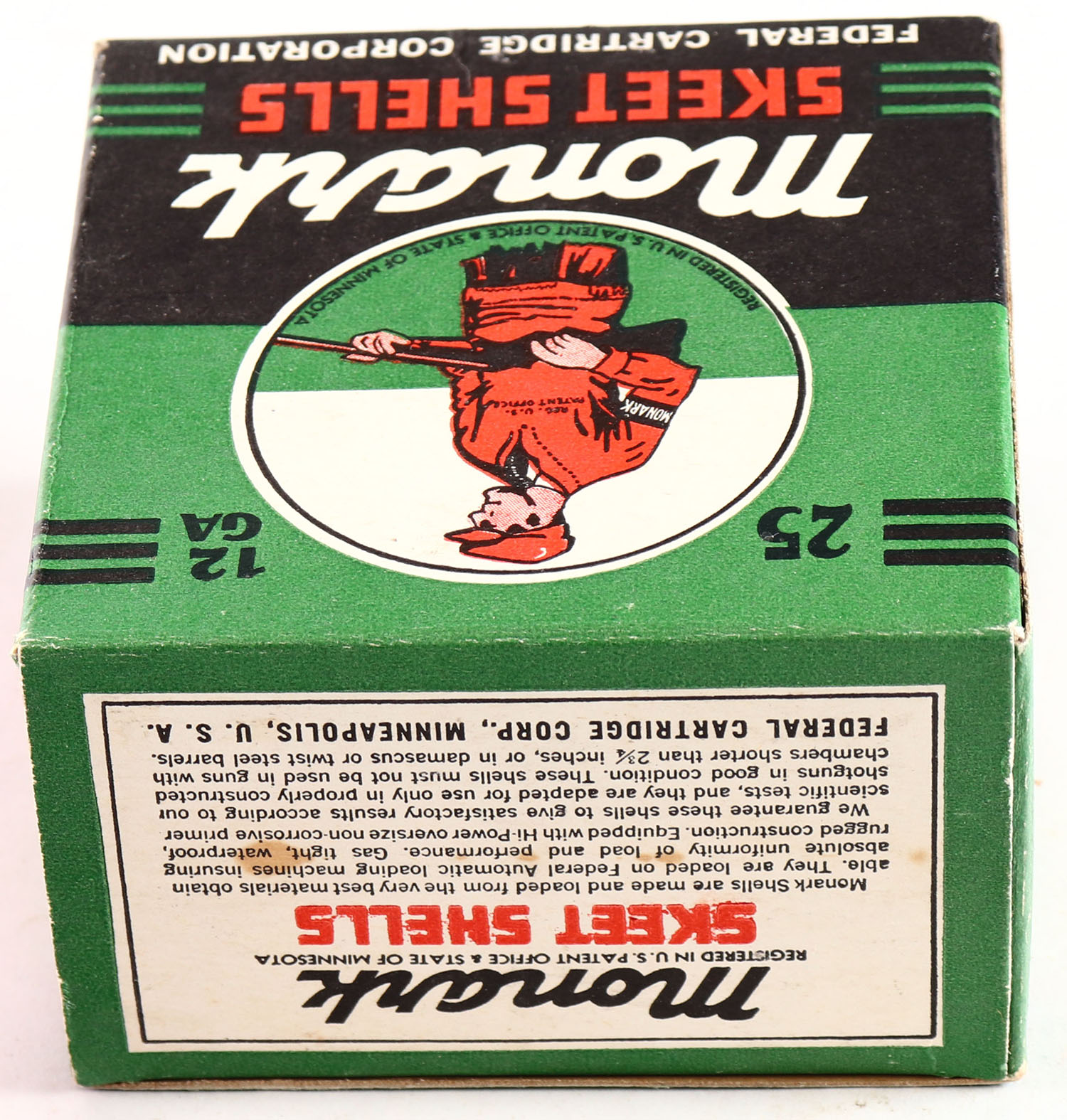 Federal Monark, Skeet Shells, 12ga., 1pc., Empty, shot size 8 Seconds, green, red & black box that pictures trap shooter with red sweater & cap, box is very solid with great color. Grade: Excellent ++ - Value: 20 to 40