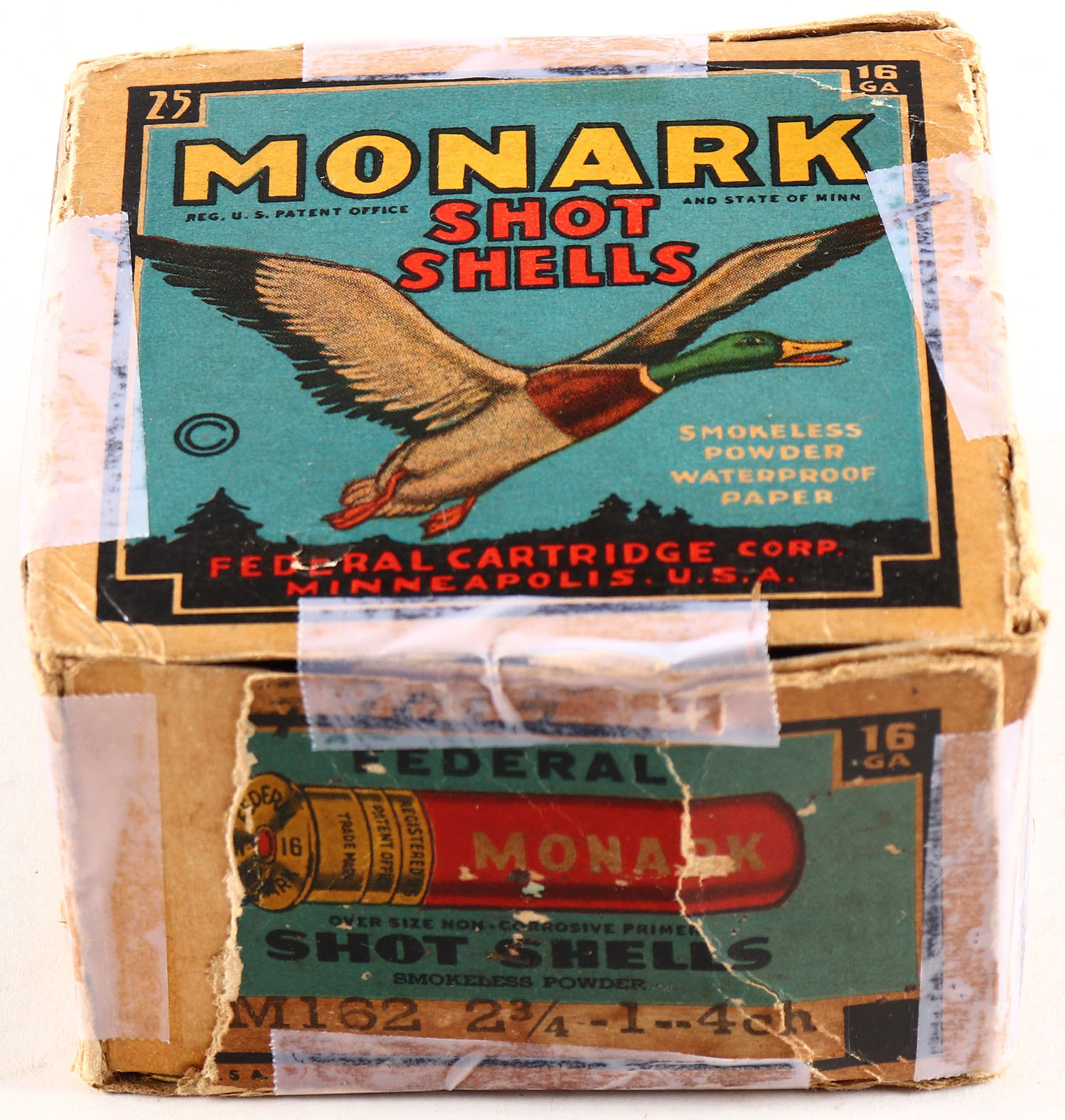 Federal Cart. Co., MONARK, 16ga., 1pc., Full, shot size 4ch, Black border, blue, yellow and red box with flying mallard, box has torn flap, box has edge wear with very nice color, Shells are good. Grade: Very Good ++ - Value: 20 to 40