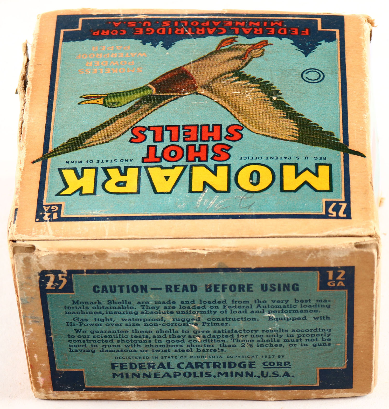 Federal Cart. Co., MONARK, 12ga., 1pc., Full, shot size 9, Black border, blue, yellow and red box with flying mallard, box has soiling, bottom flap is torn, Shells are very good. Grade: Very Good ++ - Value: 20 to 40
