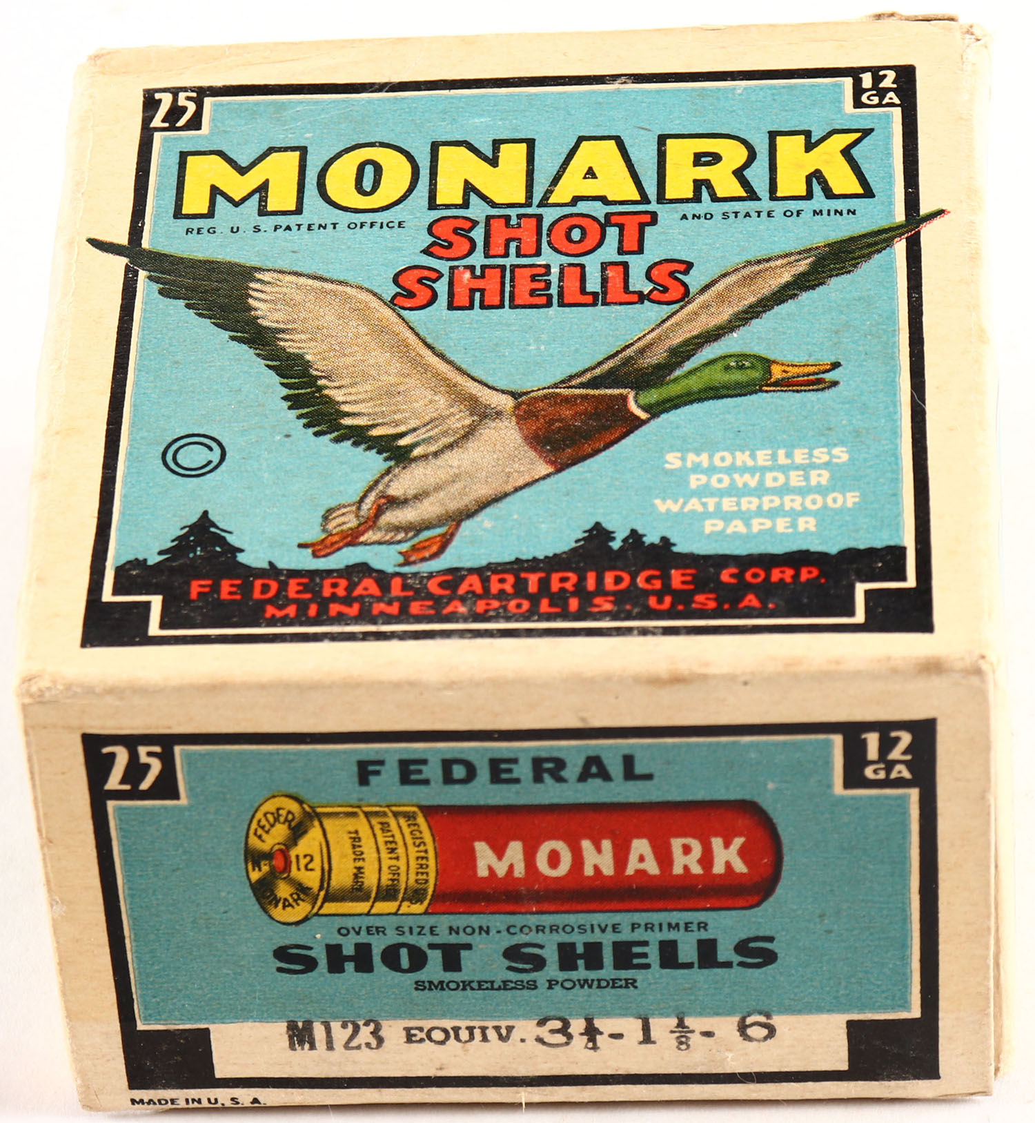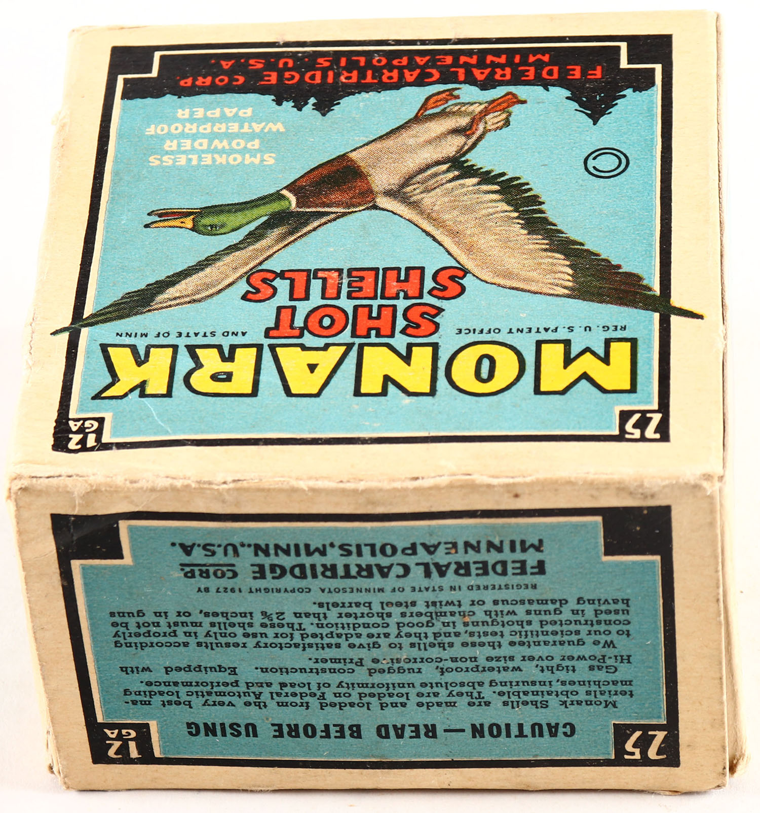 Federal Cart. Co., MONARK, 12ga., 1pc., Full, shot size 6, Black border, blue, yellow and red box with flying mallard, box has light soiling with nice color, Shells are good. Grade: Excellent + - Value: 20 to 40