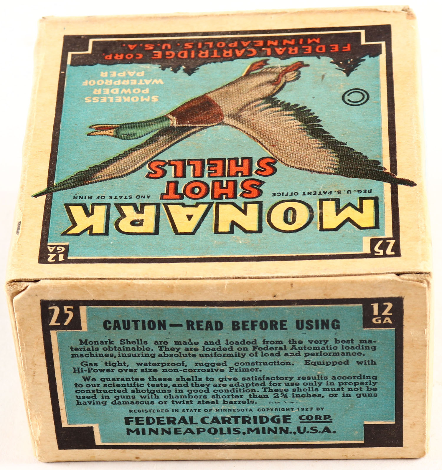 Federal Cart. Co., MONARK, 12ga., 1pc., Full, shot size 4c, Black border, blue, yellow and red box with flying mallard, box has light soiling with nice color, Shells are very good. Grade: Excellent - Value: 20 to 40