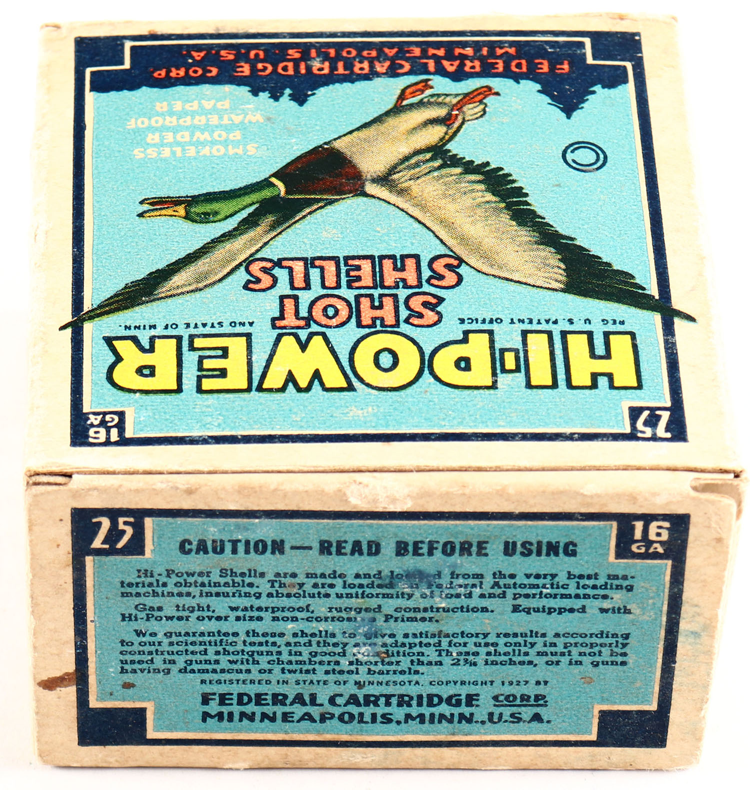 Federal Cart. Co., HI-POWER, 16ga., 1pc., Full, shot size 6, Blue border, blue, yellow and red box with flying mallard, box is very solid with some scuffing, Shells are excellent. Grade: Excellent + - Value: 20 to 40