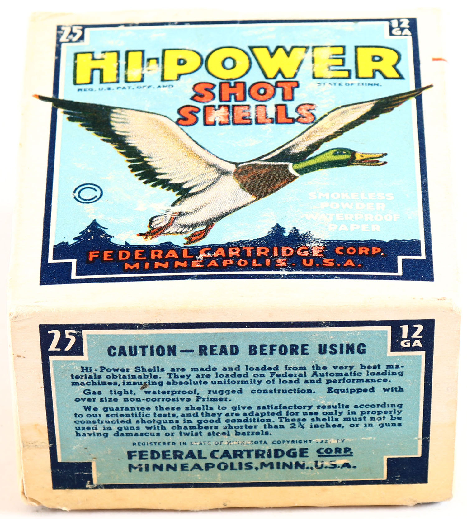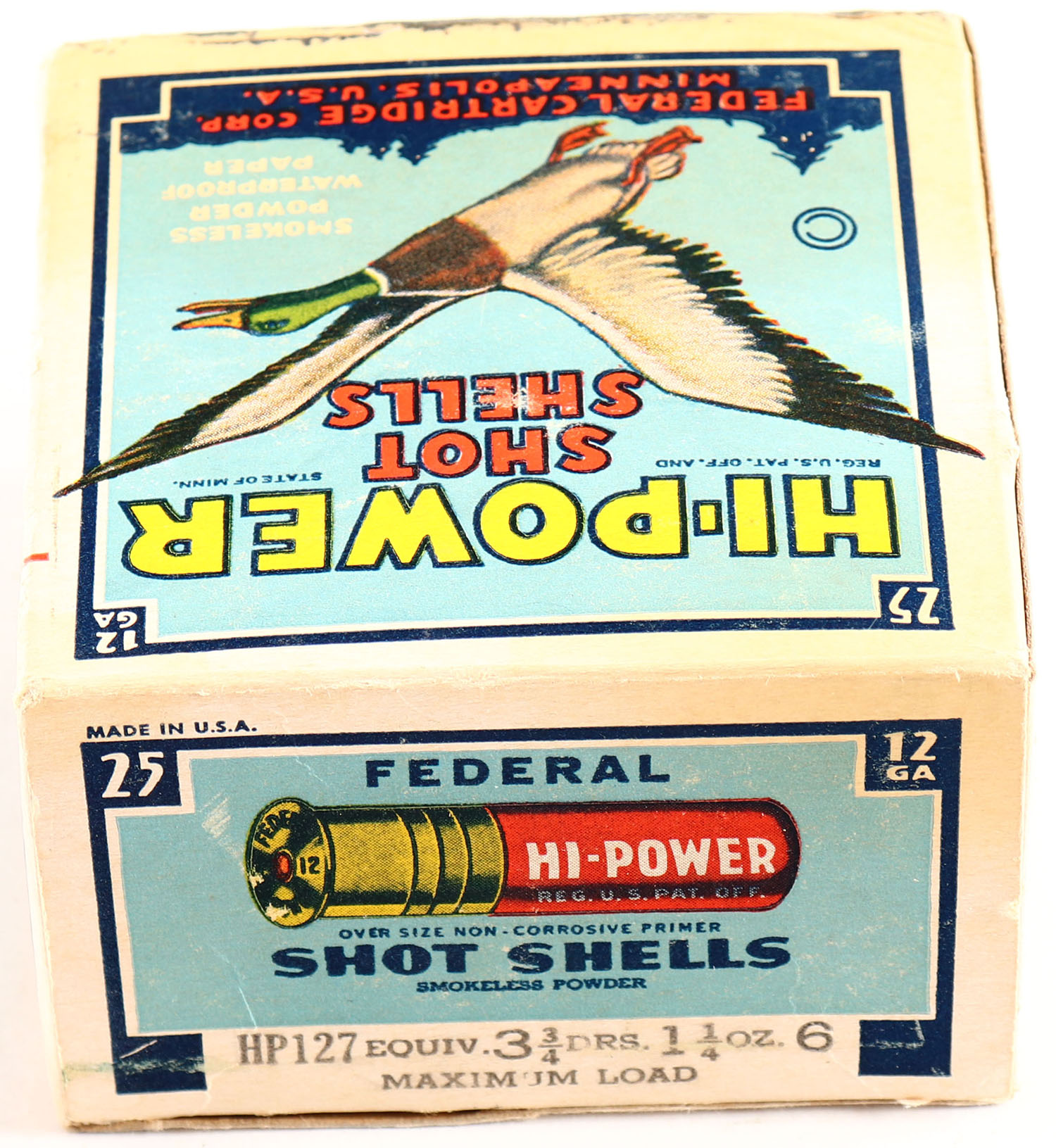 Federal Cart. Co., HI-POWER, 12ga., 1pc., Partial 14 rds., shot size 6, Black border, blue, yellow and red box with flying mallard, box has light soiling with very nice color, Shells are very good. Grade: Excellent - Value: 20 to 40