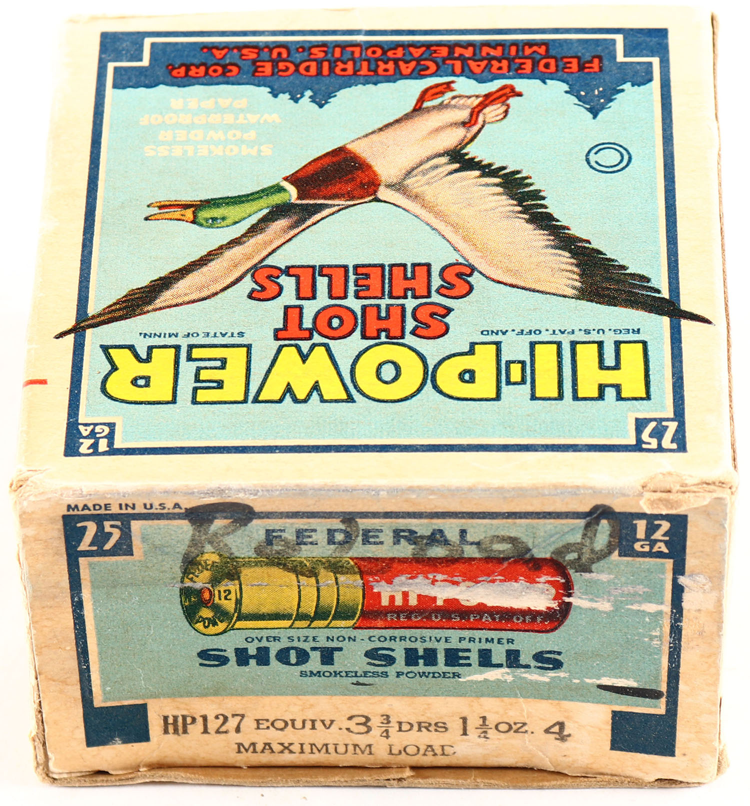 Federal Cart. Co., HI-POWER, 12ga., 1pc., Empty, shot size 4, Blue border, blue, yellow and red box with flying mallard, box has light soiling with great color. Grade: Excellent - Value: 10 to 40