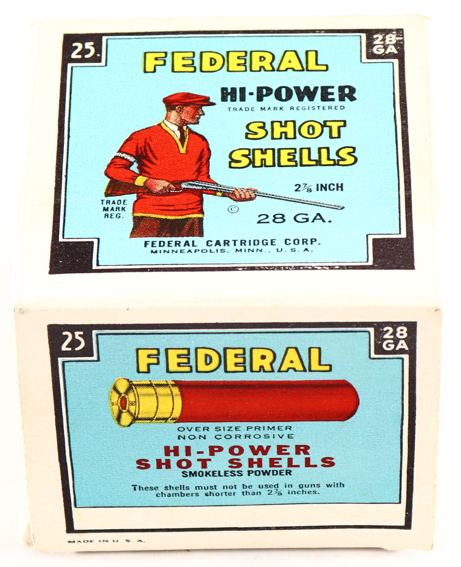 Federal Cart. Co., HI-POWER, 28ga., 1pc., Full, shot size ?, Blue border, blue, yellow and red box with Trap Shooter, box is very solid with great color. Grade: MINT - Value: 20 to 40