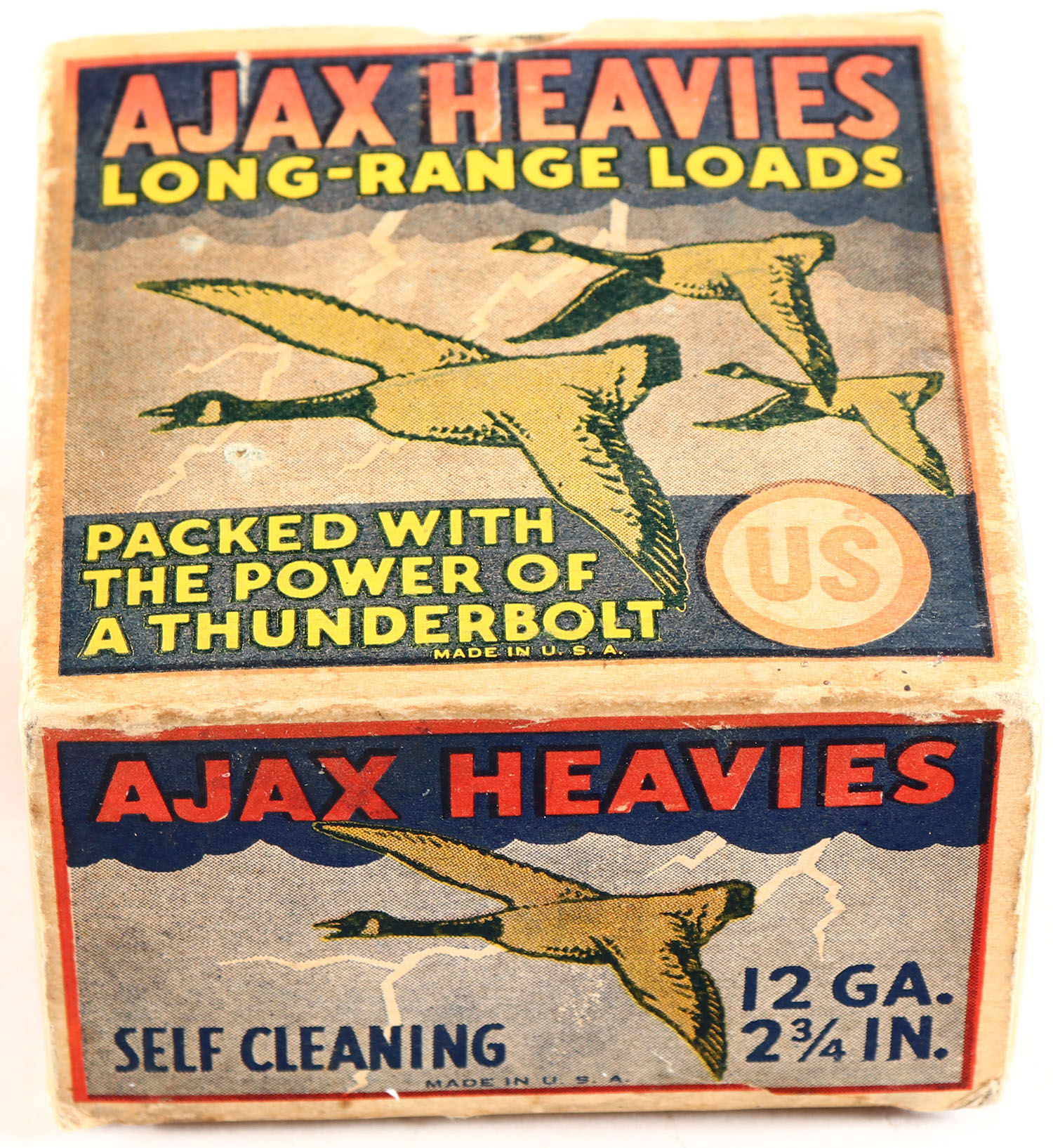 U.S. Cart. Co., AJAX HEAVIES, 12ga., 2 3/4'', 1pc., Empty, shot size 4 CH, multi colored box with three geese in lighting storm, box is solid with some age soiling & edgewear, box is nice with great colors. * Grade: Very Good ++ - Value: 500 to 1000