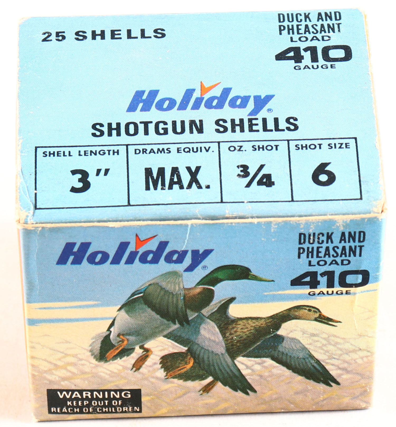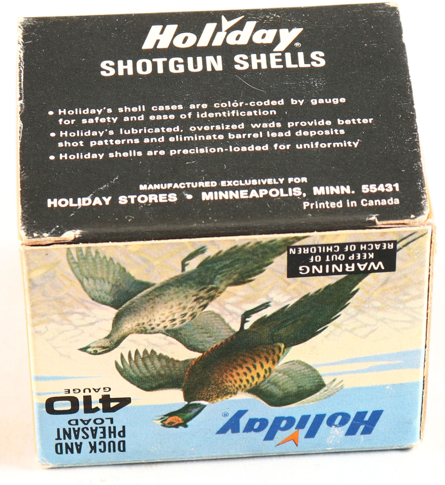 Holiday, Mallards/Pheasants, 410ga, 3'', 1pc., Full, shot size 6, multi color graphics by Les Kouba, box is very solid with excellent colors, Shells are excellent. Grade: MINT - Value: 100 to 200