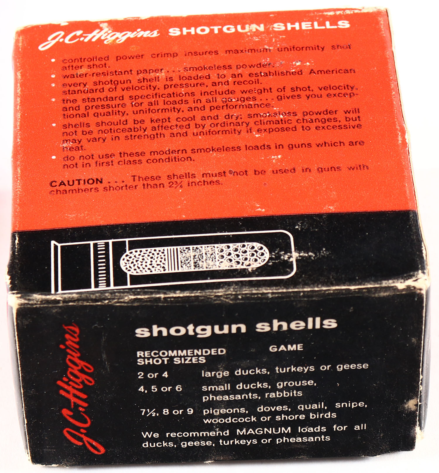 Sears, J.C. Higgins, Xtra-Range, 12ga., 1pc., Full, shot size 2, multi-colored box, box has light scuffing with great color, Shells are excellent. Grade: Very Good ++ - Value: 10 to 30
