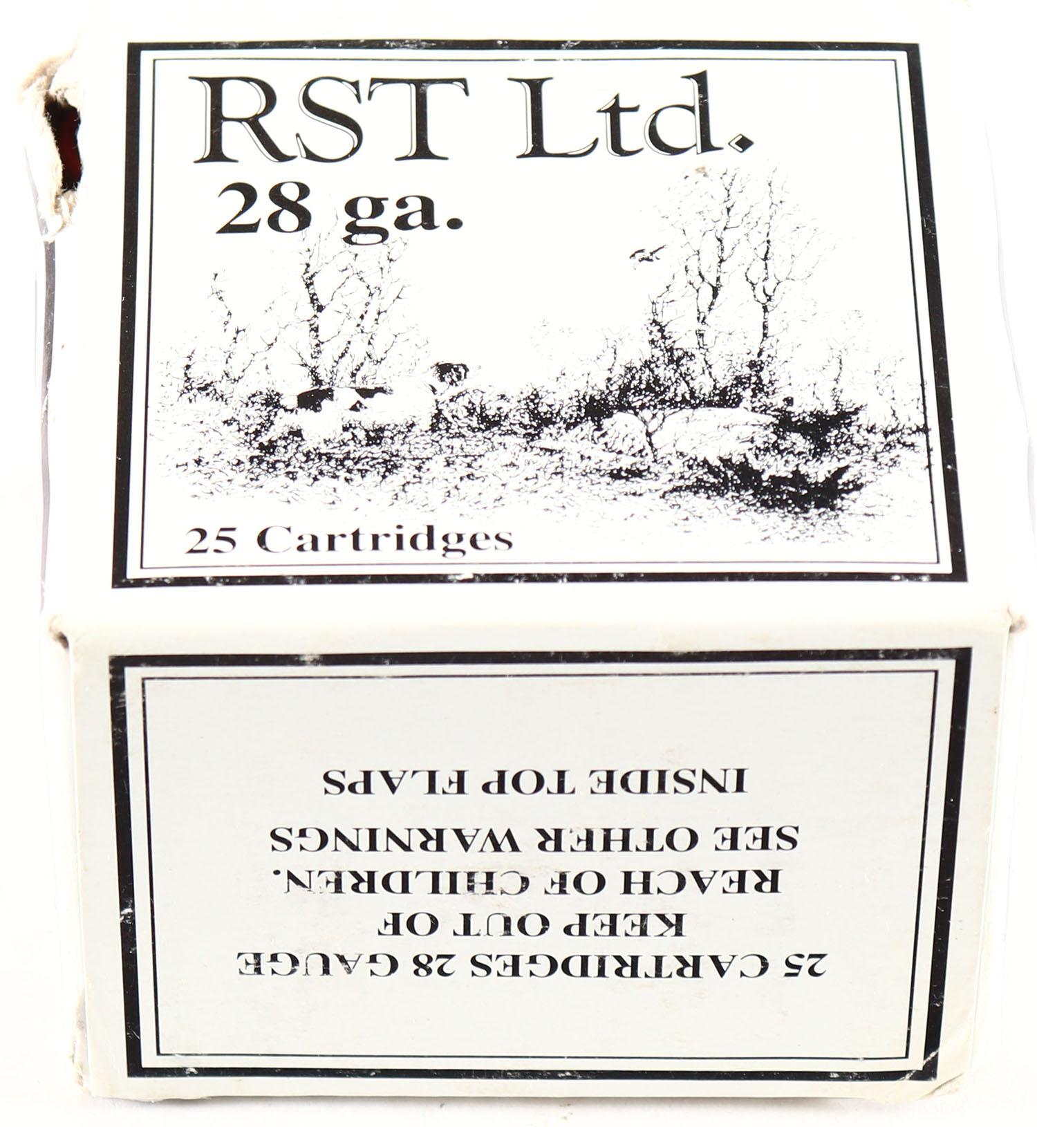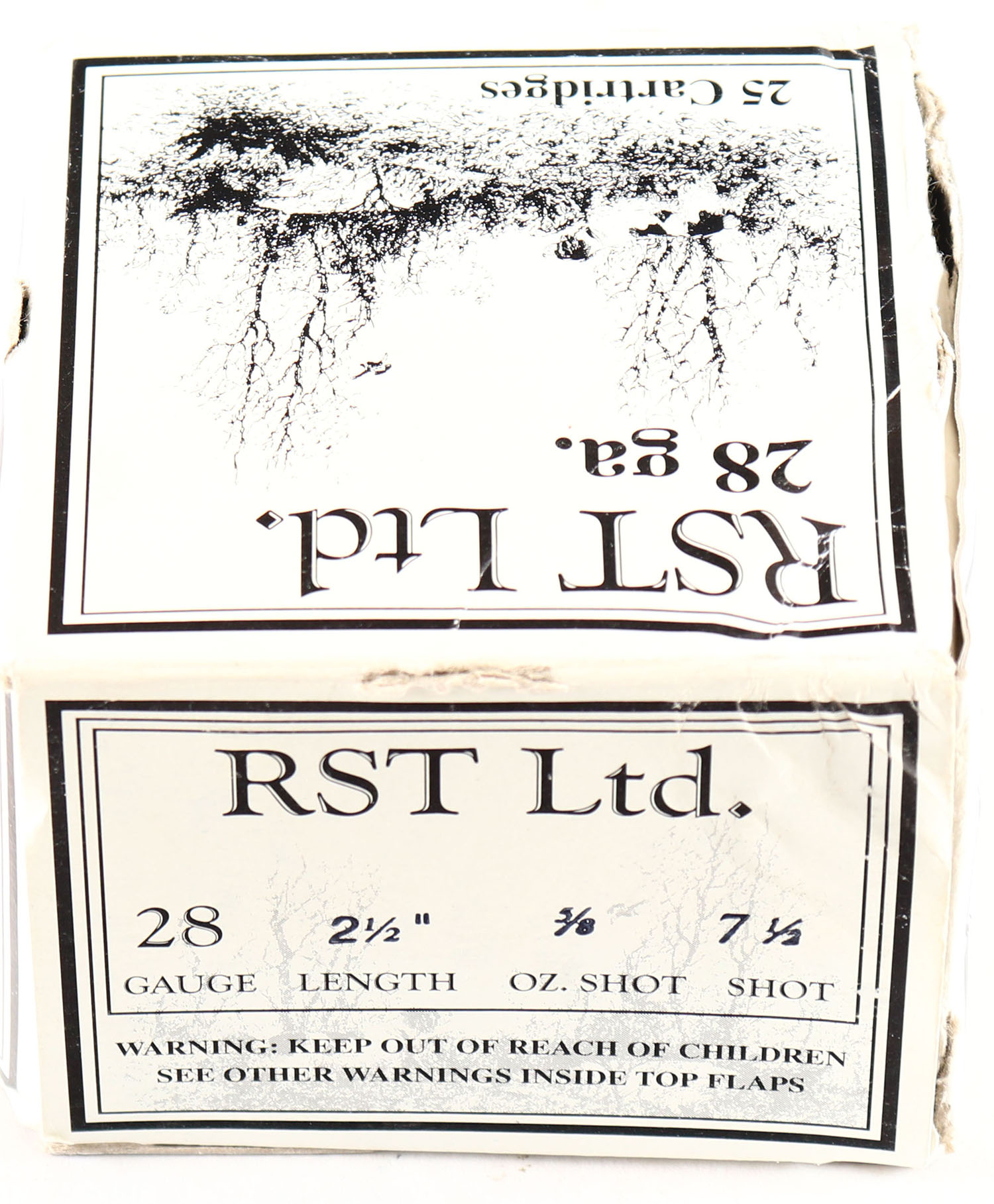 RST Ltd., 28ga., 2 1/2'', 1pc., shot size 7 1/2, box has shell protrusions & light soiling with very nice color, shells are very good. Grade: Very Good - Value: 10 to 30