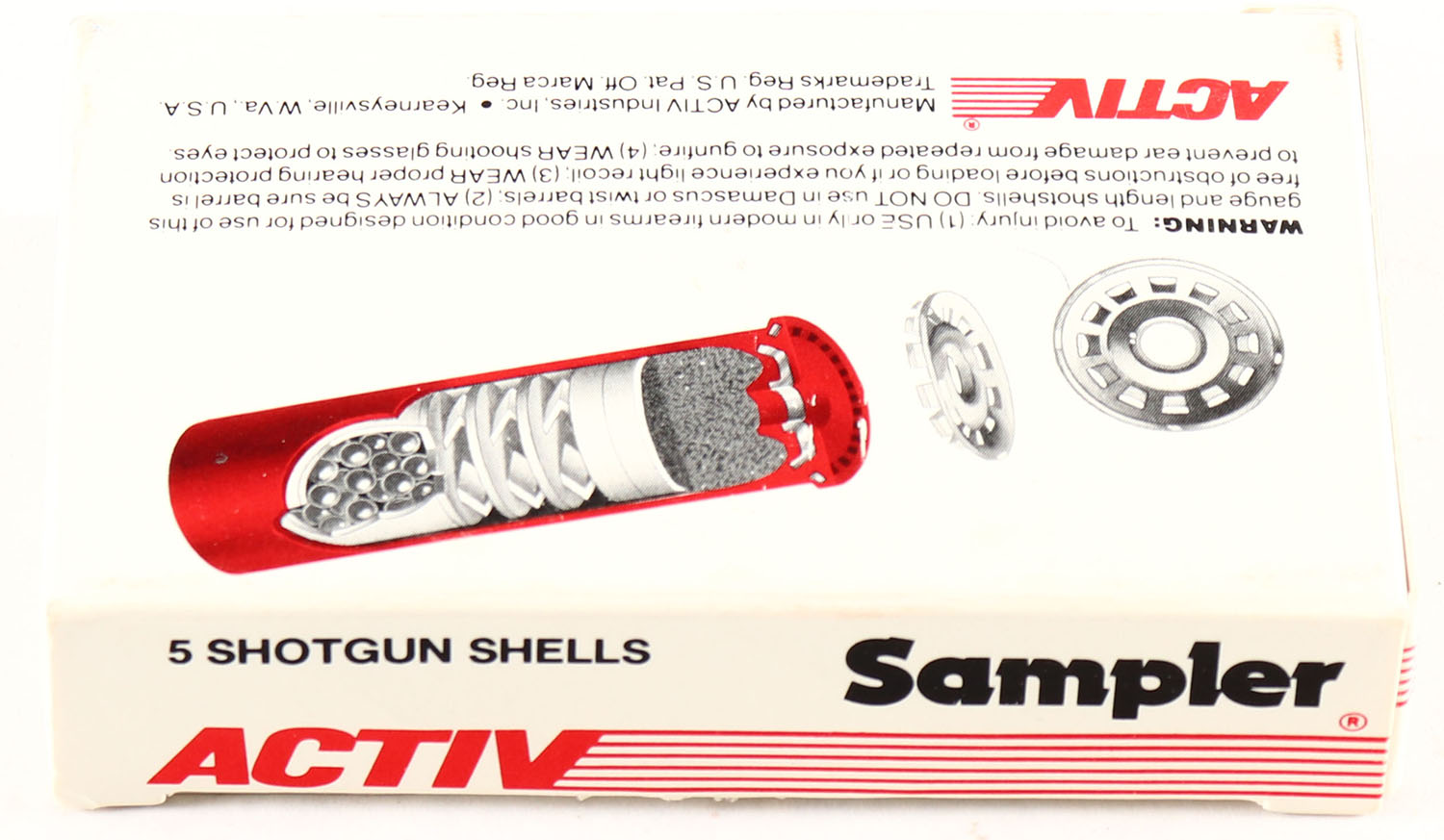 Activ, Sampler, 12ga., 1pc., Full, shot size 9, multi-colored box, box is very solid, shells are excellent. Grade: Excellent ++ - Value: 8 to 16