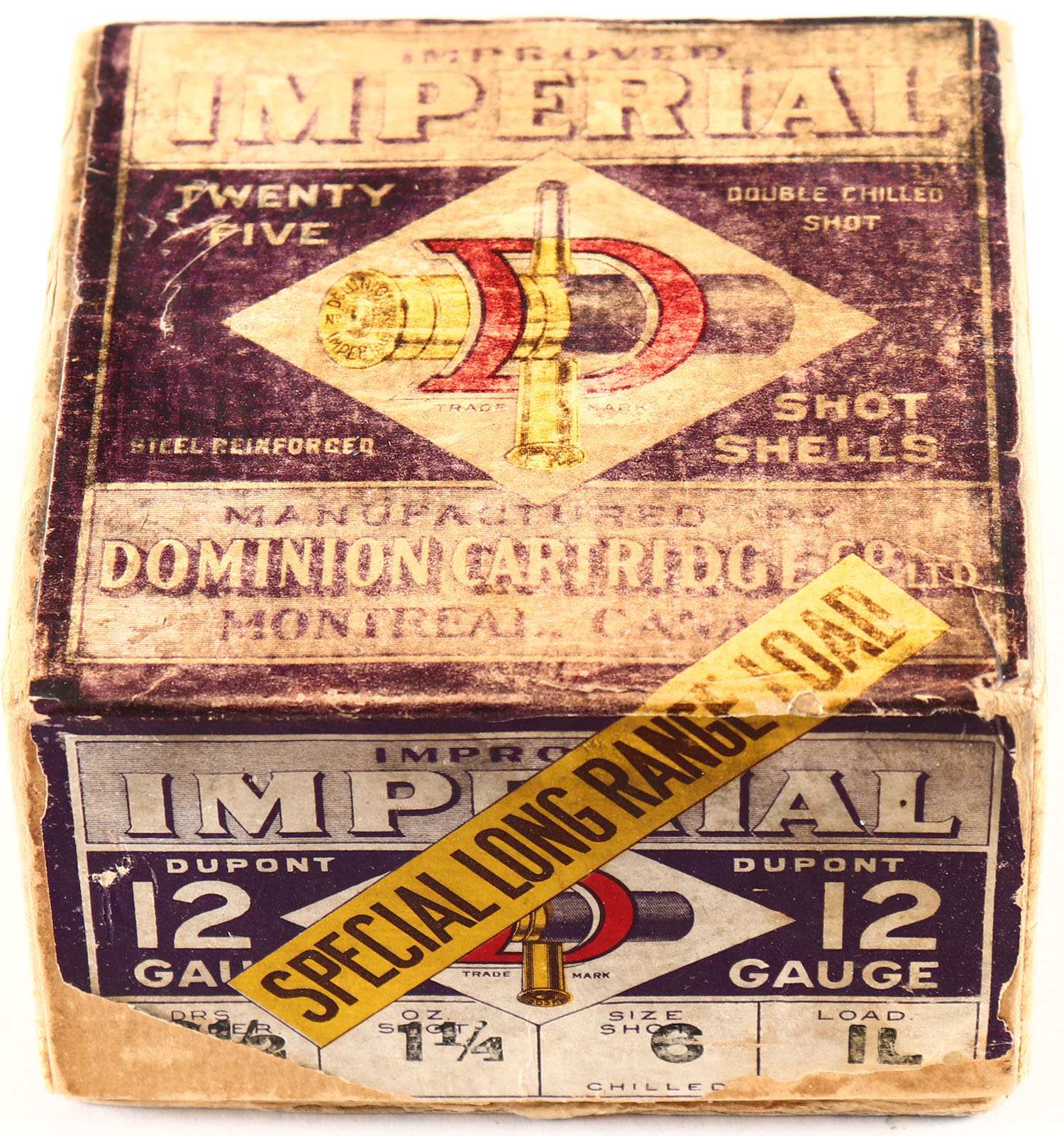 Dominion Cartridge Co, IMPERIAL, 12ga., 2pc., Empty, shot size 6, has early Bent D Logo, OVER LABEL ''SPECIAL LONG RANGE LOAD'', box is solid with age soiling to label. Grade: Very Good ++ - Value: 50 to 500