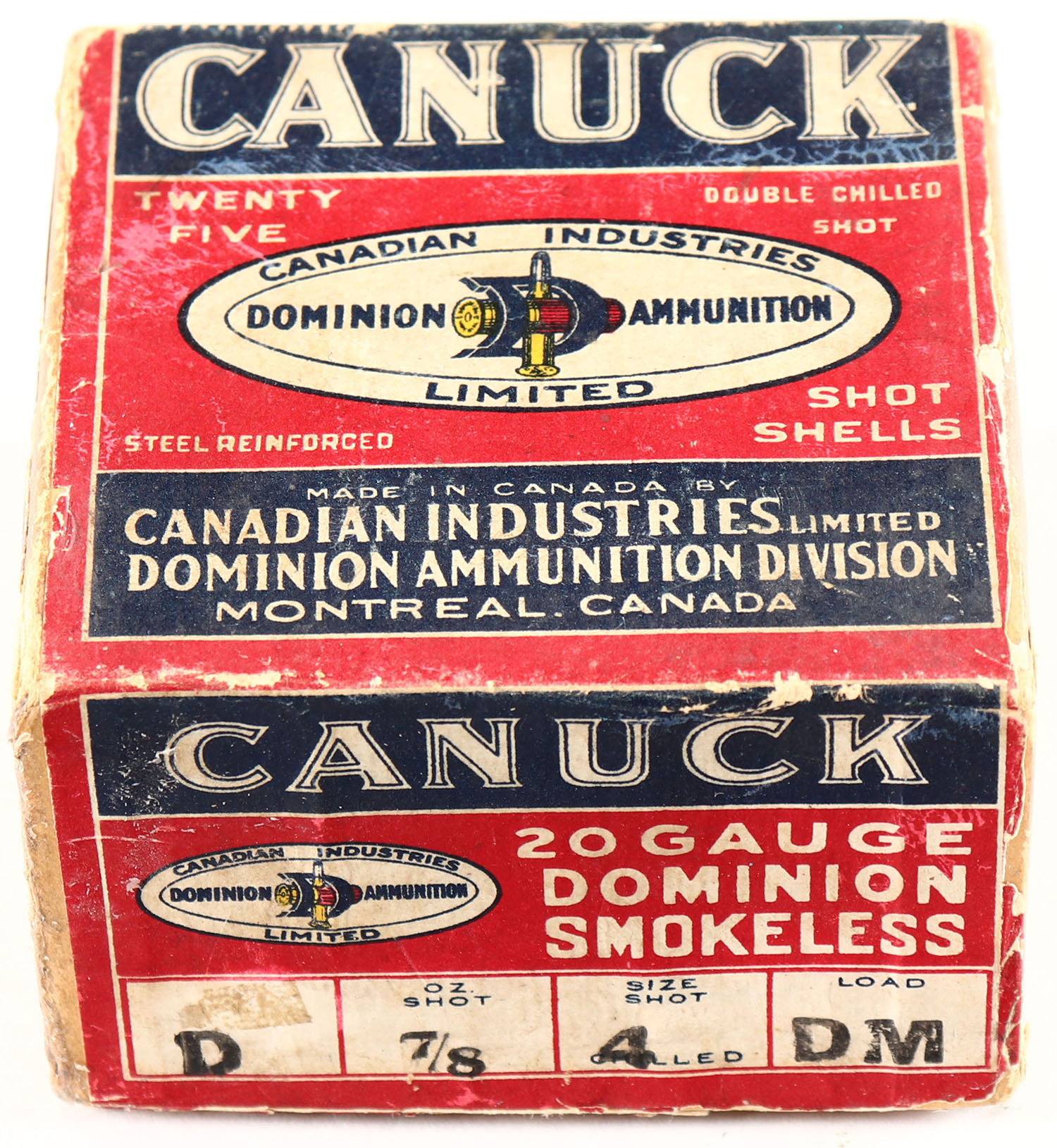 Dominion Cart. Co., Canuck, 12ga., 2pc., Empty, shot size 4CH, red, blue & white box, box has scuffing & light soiling, box is solid with nice colors, HARD TO FIND BOX! Grade: Excellent - Value: 100 to 500