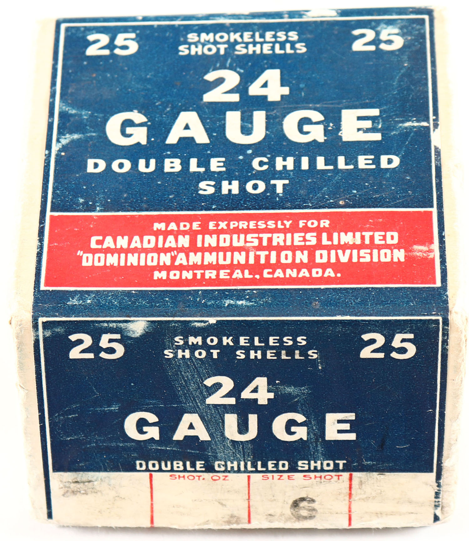 CIL, 24 GAUGE, 24ga., 2pc., Empty, shot size 6, buff box with good color to label, box has scuffing & light soiling. VERY RARE IN 24 GAUGE! Grade: Very Good ++ - Value: 50 to 400