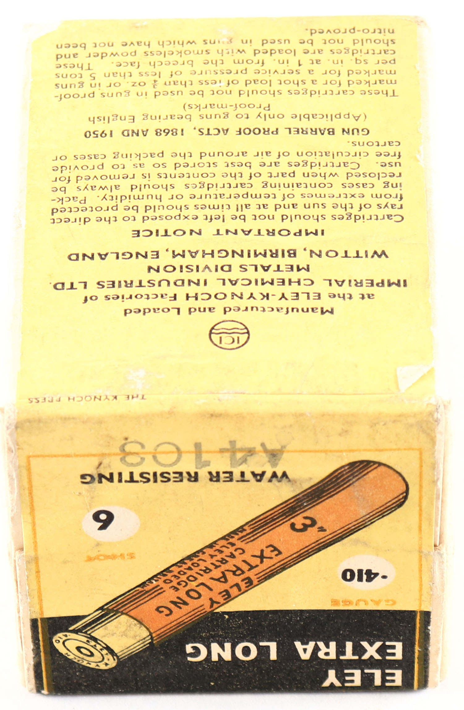 Eley, 410ga., 1pc., FULL & SEALED, 3'', buff box with yellow & black label, box has age soiling & light scuffing. Grade: Excellent + - Value: 20 to 100