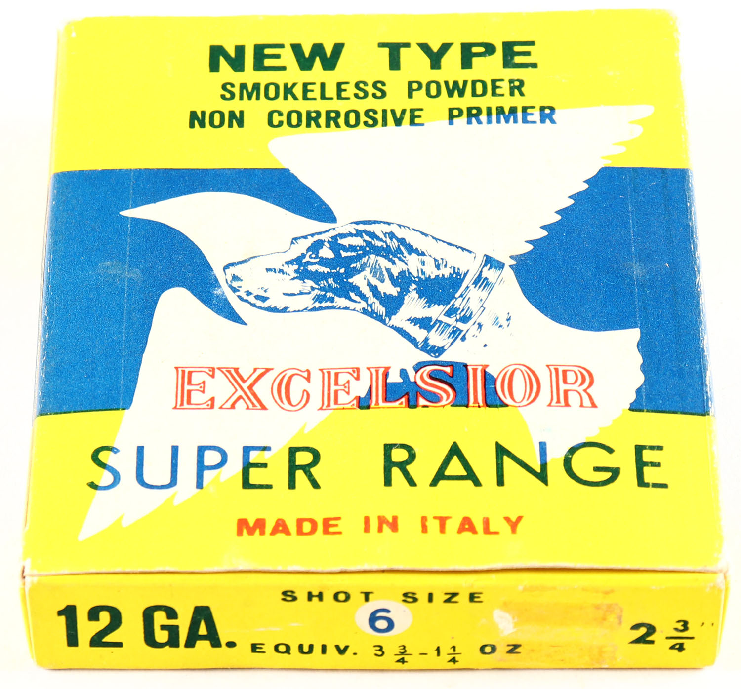 Excelsior, Super Range, 12ga., 1pc., Full, shot size 6, box is solid with great colors, shells are excellent. Grade: Excellent + - Value: 10 to 30