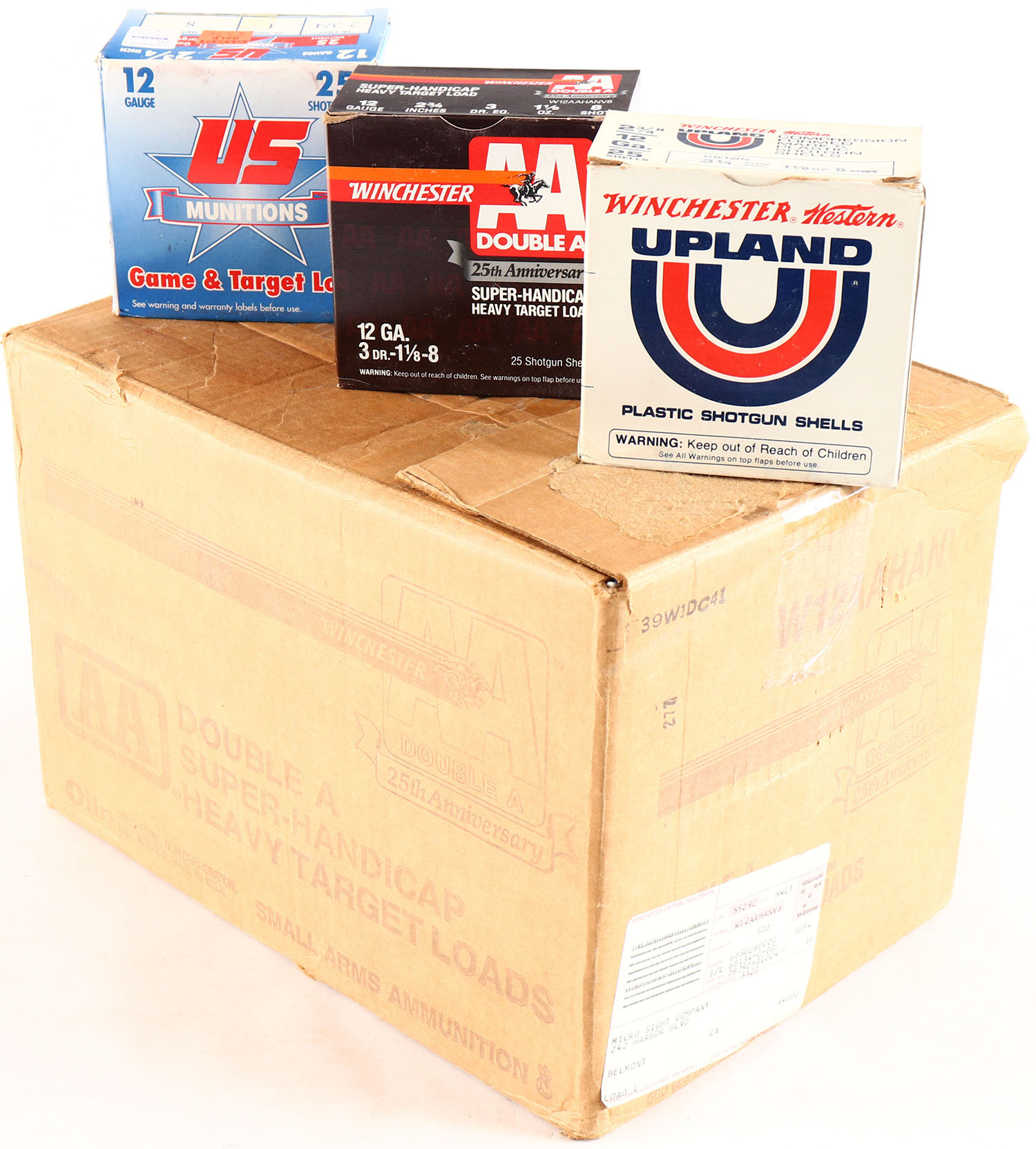 FULL CASE of mixed Shotshell boxes, 12ga., Full, 11 boxes of Winchester AA Super-Handicap shot size 8, 4 boxes of US Munitions shot size 7 1/2, 3 boxes of US Munitions shot size 8, 2 boxes of Winchester Upland shot size 6. 20 Total boxes, shells are very good. Grade: Very Good ++ - Value: 50 to 150