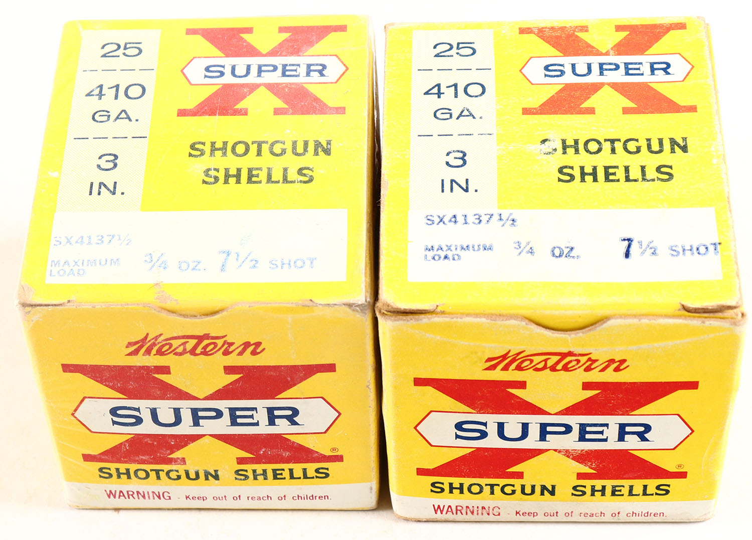 Lot of 2 Western Super X, 410ga., 1pc., Appears Full, shot size 7 1/2, multi-colored boxes. Grade: Excellent - Value: 10 to 60