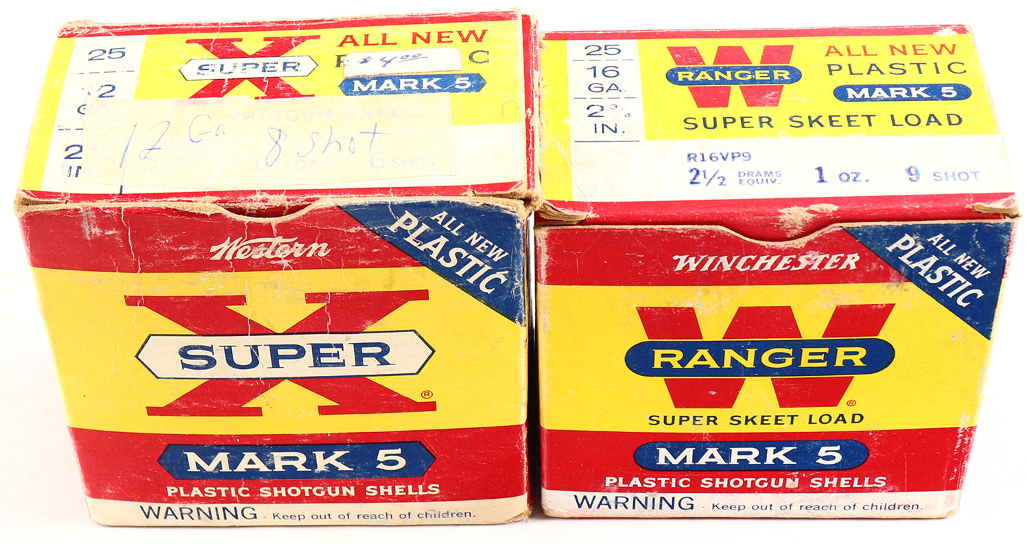 Lot of 2 Winchester/ Western, 12ga., 1pc., Appears Full, shot size 9 & 6, multi-colored boxes. Grade: Very Good - Value: 10 to 30