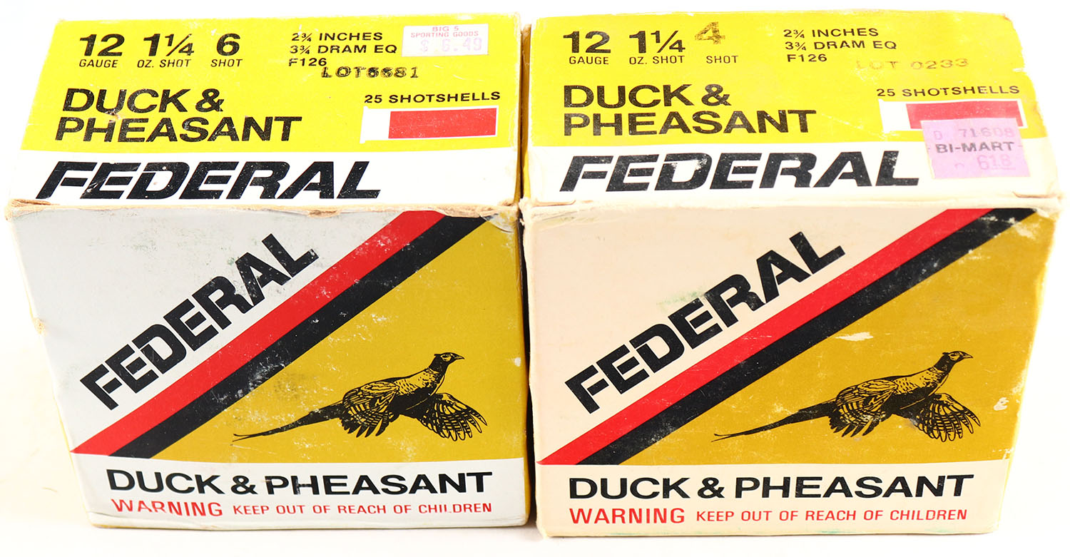 Lot of 2 Federal, 12ga., 1pc., Appears full, shot size 4 & 6, multi-colored boxes. Grade: Very Good ++ - Value: 10 to 30