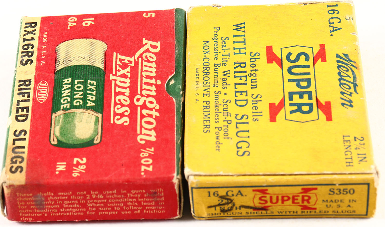 Lot of 2 remington & Western, 16ga., 1pc., Appears full, shot size Rifled Slugs, multi-colored boxes. Grade: Very Good + - Value: 8 to 30