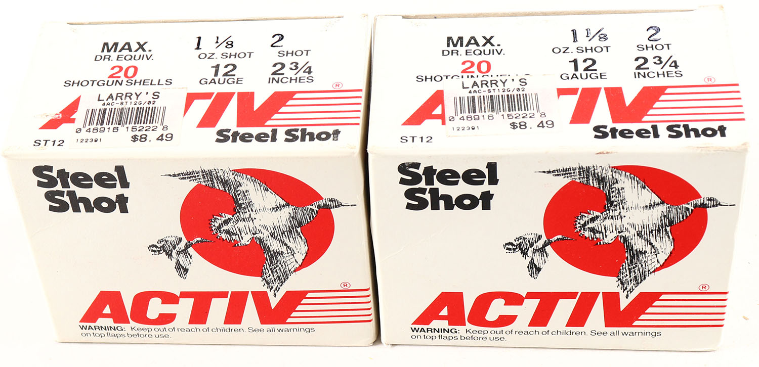 Lot of 2 Activ, 12ga., 1pc., Full, shot size 2, multi-colored boxes, box is very solid, shells are excellent. Grade: Excellent + - Value: 10 to 30