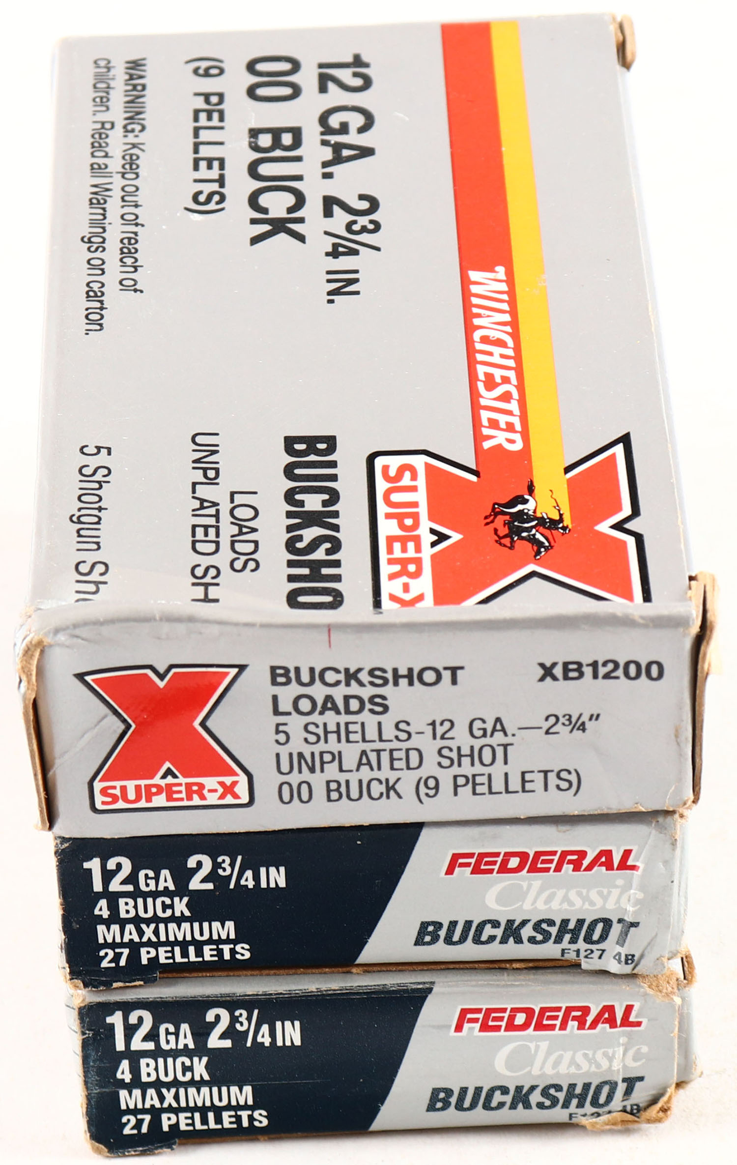 Lot of 3 Federal & Winchester, 12ga., 1pc., Appears Full, shot size 00 Buck, multi-colored boxes. Grade: Very Good + - Value: 10 to 30