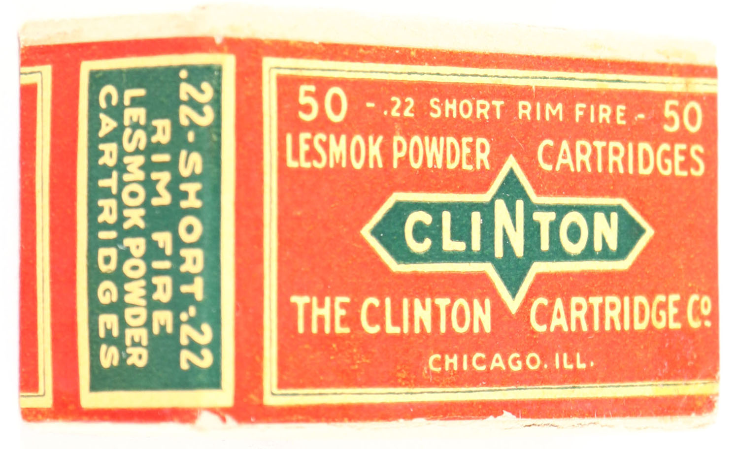Clinton, Lesmok Powder Cartridges, .22 Short, RHWeb: CLINT-1 S-2.1a, FULL & SEALED, 2pc. Buff box with red & green wraparound label, box is solid with excellent color, very minor edge & corner wear, label is intact. Grade: Excellent + - Value: 60 to 240