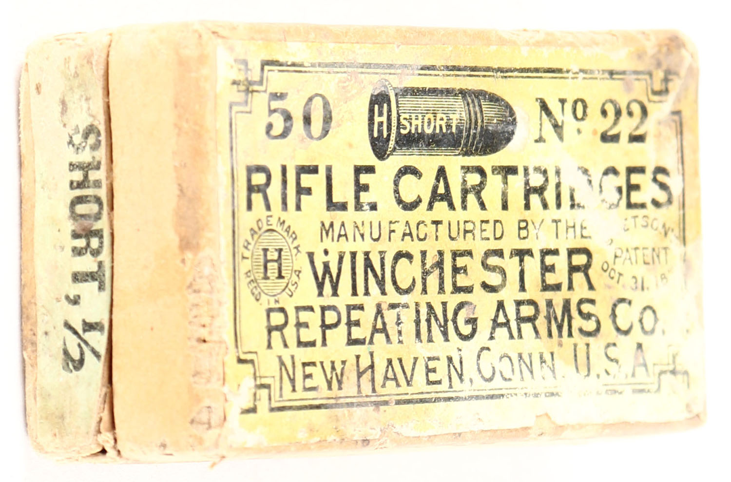 Winchester, Rifle Cartridges, .22 Short, RR: Unknown as the side sealing labels are mostly gone, Full of incorrect ammo, 2pc. Buff box with green top & side sealing labels, box is solid with good color, some age soiling & staining, color fading, some shelf & corner wear, minor edge wear, side sealing label is 20% intact, ammo is excellent. Grade: Good + - Value: 10 to 50