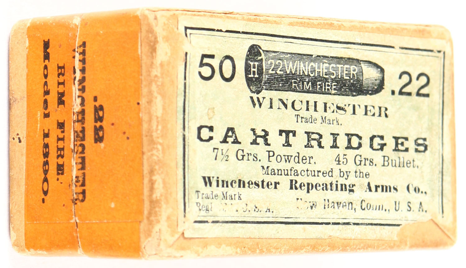 Winchester, Cartridges, .22 Winchester Rim Fire, RR: WRA-149 WRF-3a, Full, 2pc. Buff box with green top & orange side sealing labels, box is solid with very good color, minor age soiling & color fading, minor shelf & edge wear, some corner wear, labels are intact, ammo is excellent. Grade: Very Good ++ - Value: 100 to 400