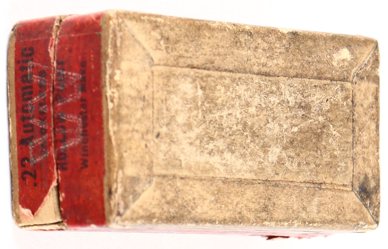 Winchester, Rim Fire Cartridges, .22 Automatic Hollow Point, RR: WRA-173 WA-16 Full, 2pc. Buff box with red top & side sealing labels, box is missing left end of lid, good color, age soiling, some shelf wear, top has been written on, edge & corner wear, labels are 99% intact, ammo is very good to excellent. Grade: Good + - Value: 40 to 200
