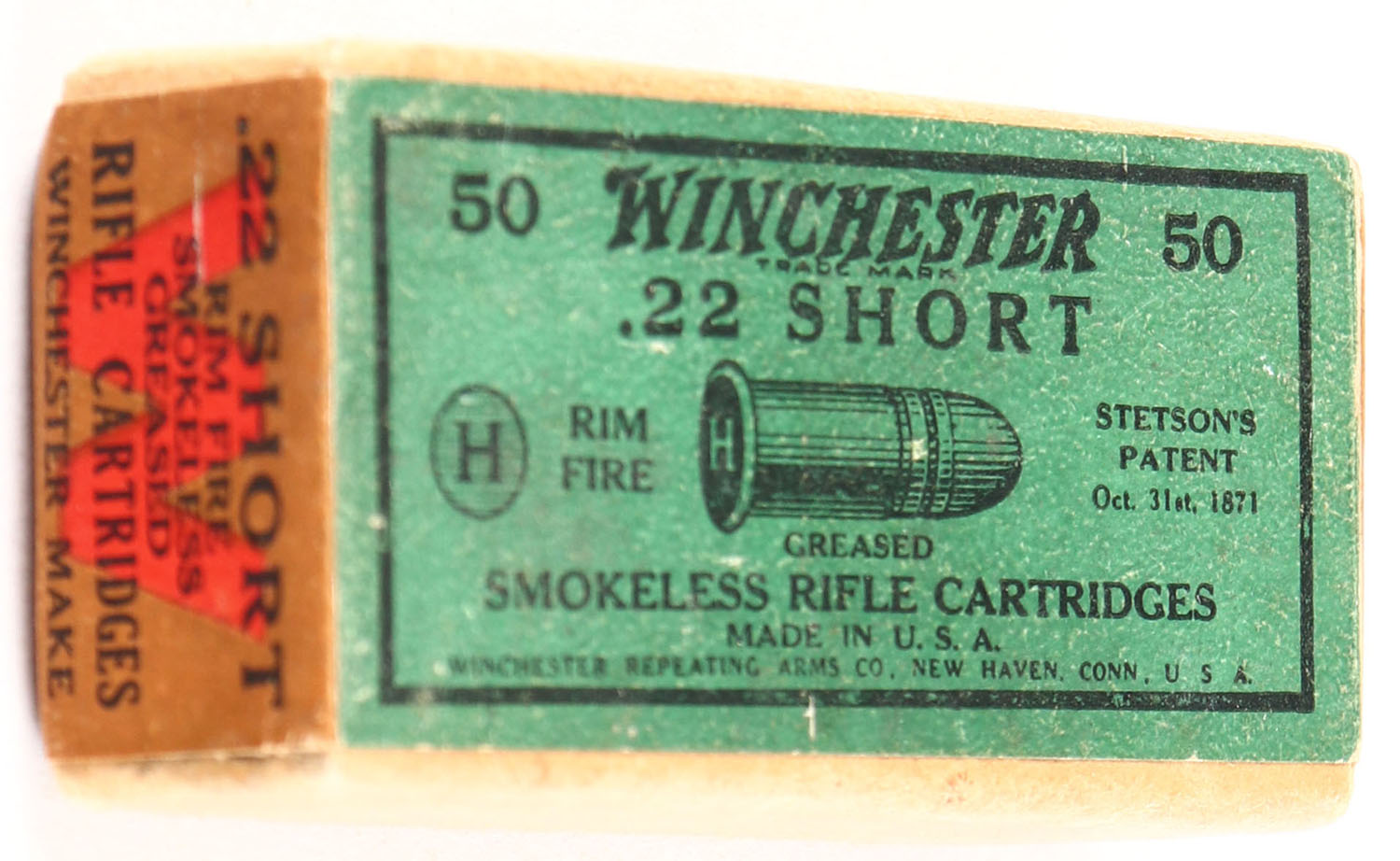 Winchester, Smokeless Rifle Cartridges, .22 Short, RR: WRA-177 S-61a, FULL & SEALED, 2pc. Buff box with green and brown wraparound label, box is solid with excellent color, minor age soiling, very minor shelf & corner wear, very minor edge wear, label is intact. Grade: Excellent + - Value: 250 to 500