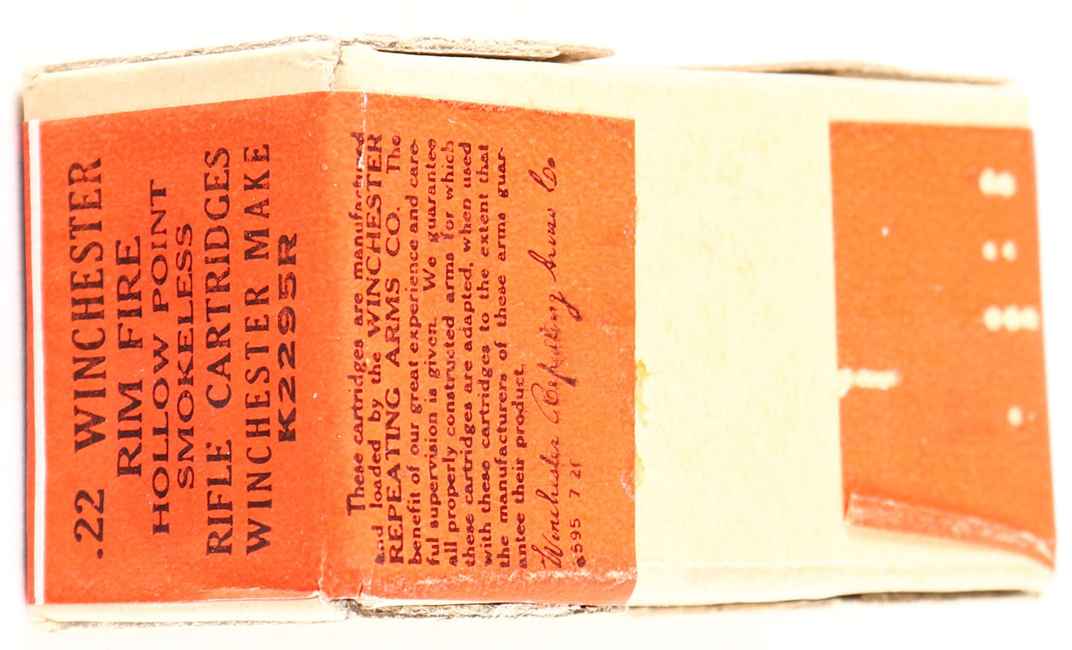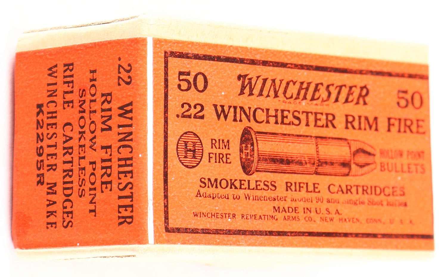 Winchester, .22 Winchester Rim Fire, Hollow Point Bullets, RR: WRA-183 WRF-49, FULL & SEALED, 2pc. Buff box with red wraparound label, box is MINT with minty color, corners are mostly sharp, edges are crisp, labels are intact. Grade: MINT - Value: 200 to 600