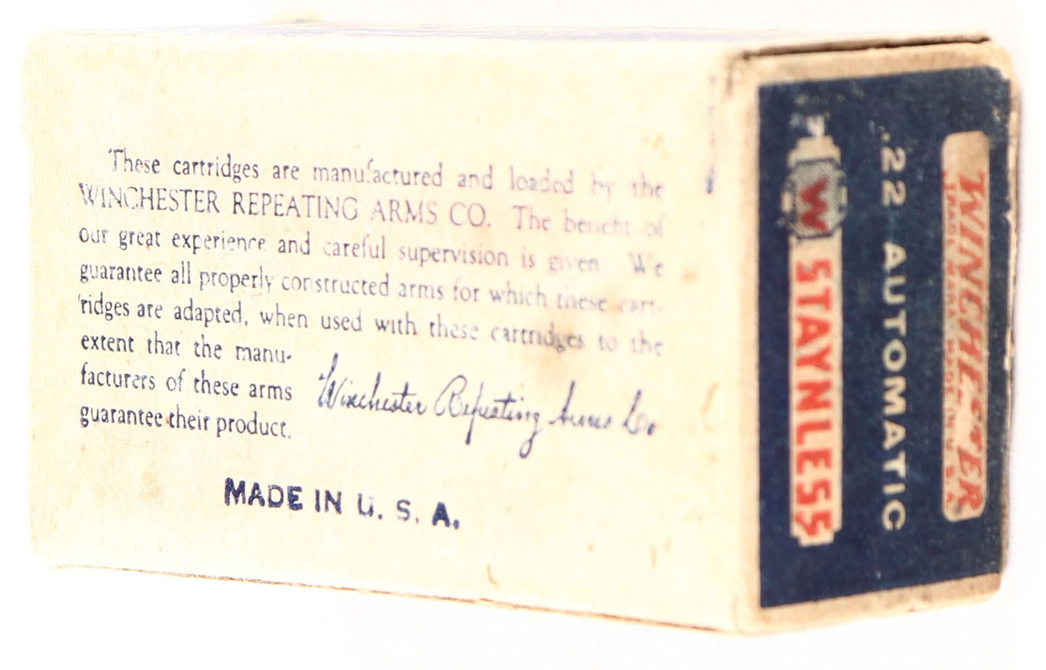 Winchester, Staynless, .22 Auto., RHWeb: WRA-12B WA-1b, Full, 1pc. Blue white & red box, box is solid with good to very good color, age soiling & shelf wear, some corner wear, minor edge wear, end flaps are solid, ammo is excellent. Grade: Very Good - Value: 40 to 120