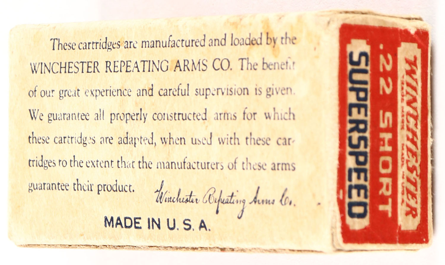 Winchester, Super Speed, .22 Short, RHWeb: WRA-13 S-1b, Full, 1pc. Red white & blue box, box is solid with very good color, some age soiling, some edge & corner wear, end flaps are solid, ammo is excellent. Grade: Very Good ++ - Value: 50 to 200