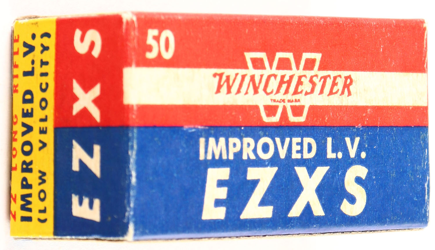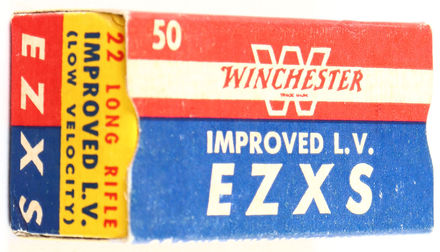 Winchester, Improved L.V. EZXS, .22 Long Rifle, RHWeb: WRA-54 LR-8a, Full, 1pc. Blue yellow & red box, box is solid with excellent color, very minor age soiling, corners are mostly sharp, edges are crisp, end flaps are solid, ammo is excellent to minty. Grade: Excellent + - Value: 20 to 80