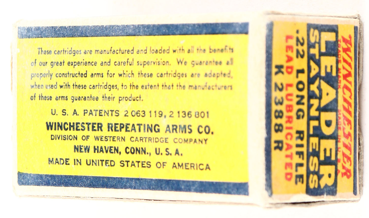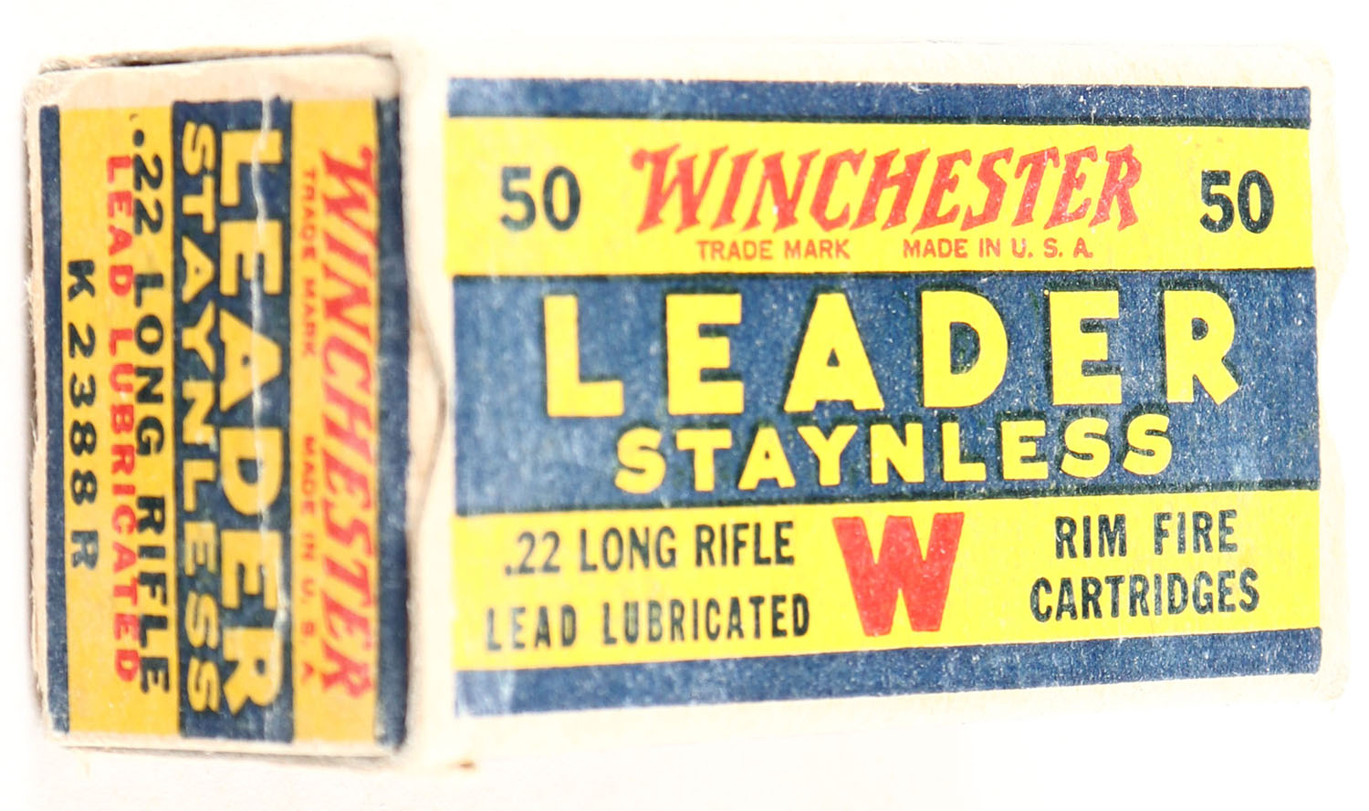 Winchester, Leader Staynless, .22 Long Rifle, RHWeb: WRA-55 LR-1c, Full, 1pc. Blue yellow & red box, box is solid with very good to excellent color, some color fading & shelf wear, minor corner wear, edges are mostly crisp, end flaps are solid, ammo is fair. Grade: Excellent - Value: 8 to 40
