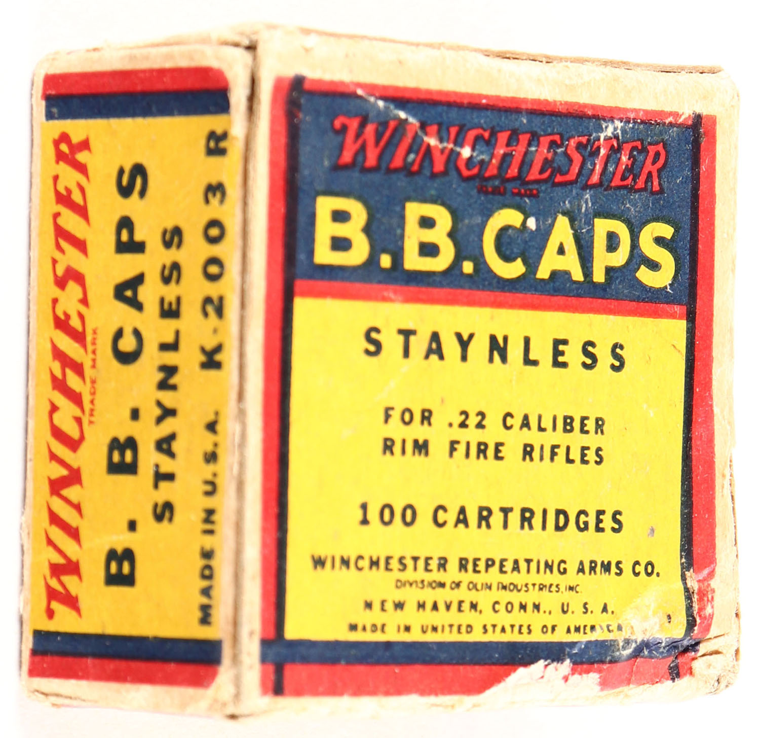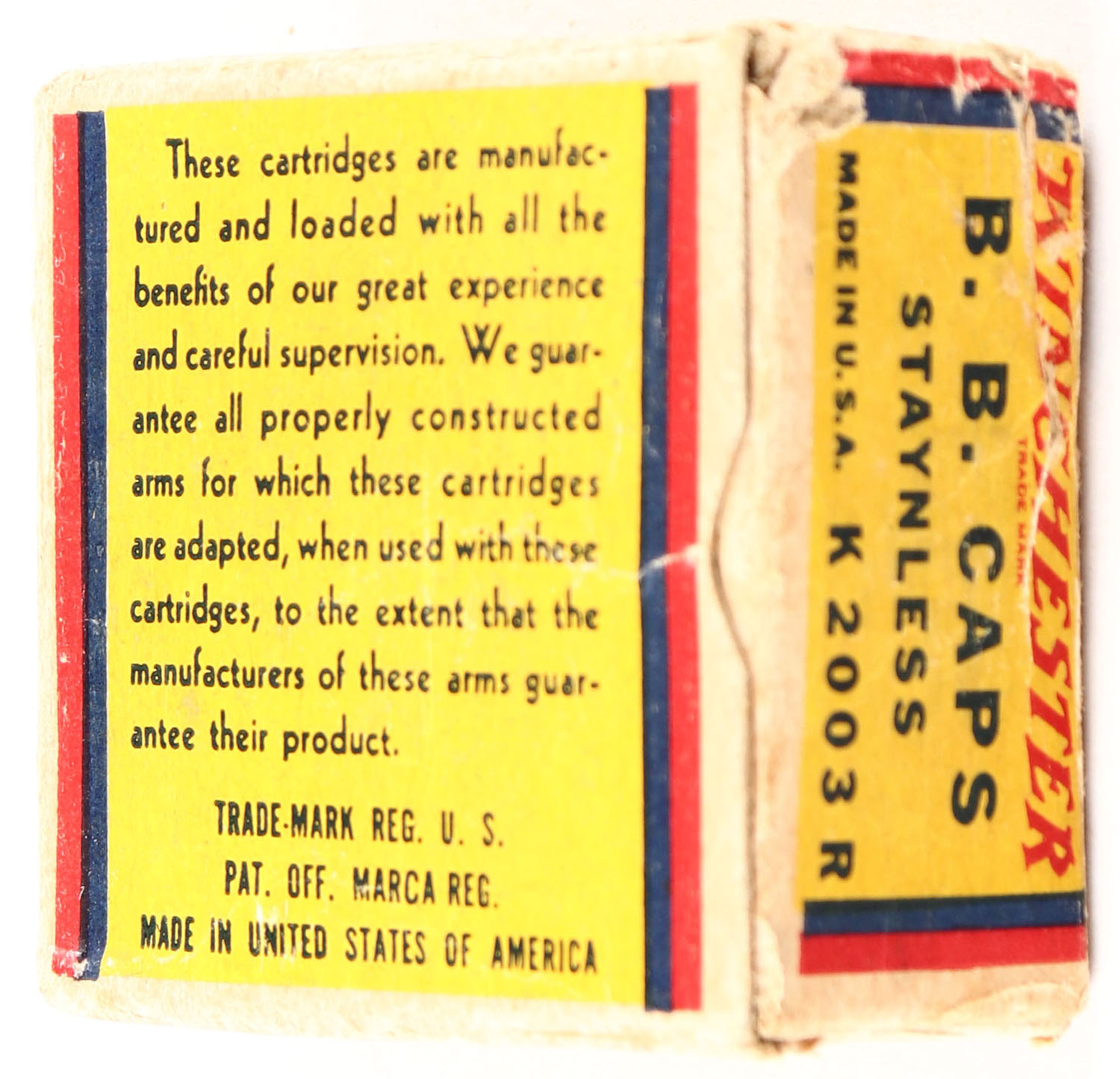 Winchester, Staynless, B.B. Caps, RHWeb: WRA-15 BB-1, Full, 1pc. Yellow blue & red box, box is solid with very good color, age soiling, corner ding on front right corner, corner wear, some edge wear, end flaps are solid, ammo is excellent. Grade: Very Good - Value: 20 to 60