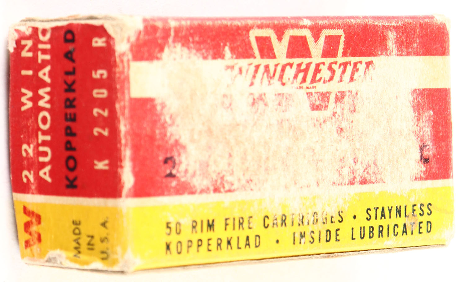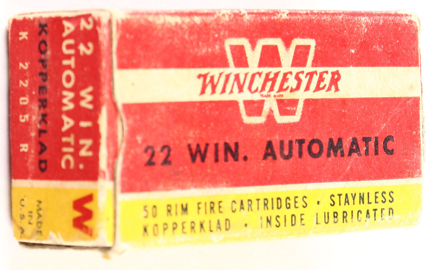 Winchester, .22 Win. Automatic, Staynless Kopperklad, RHWeb: WRA-17 WA-1a, Partial 49rds., 1pc. Red yellow & white box, box is solid with very good color, some shelf & corner wear, minor age soiling, very minor edge wear, end flaps are solid, ammo is excellent. Grade: Very Good ++ - Value: 8 to 40